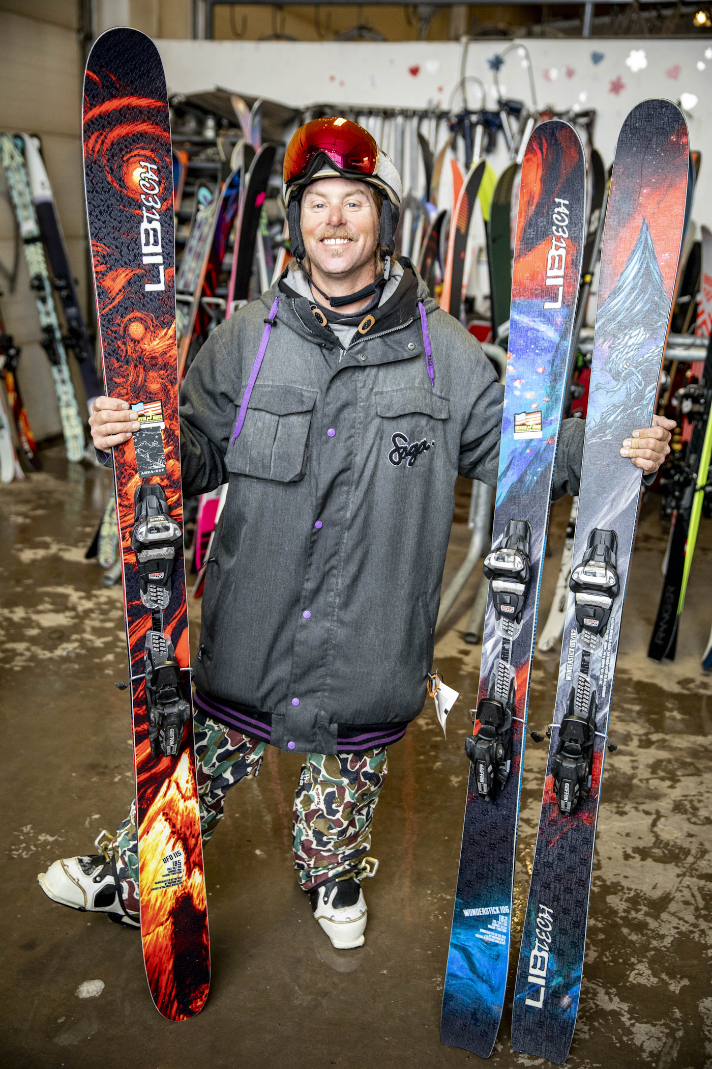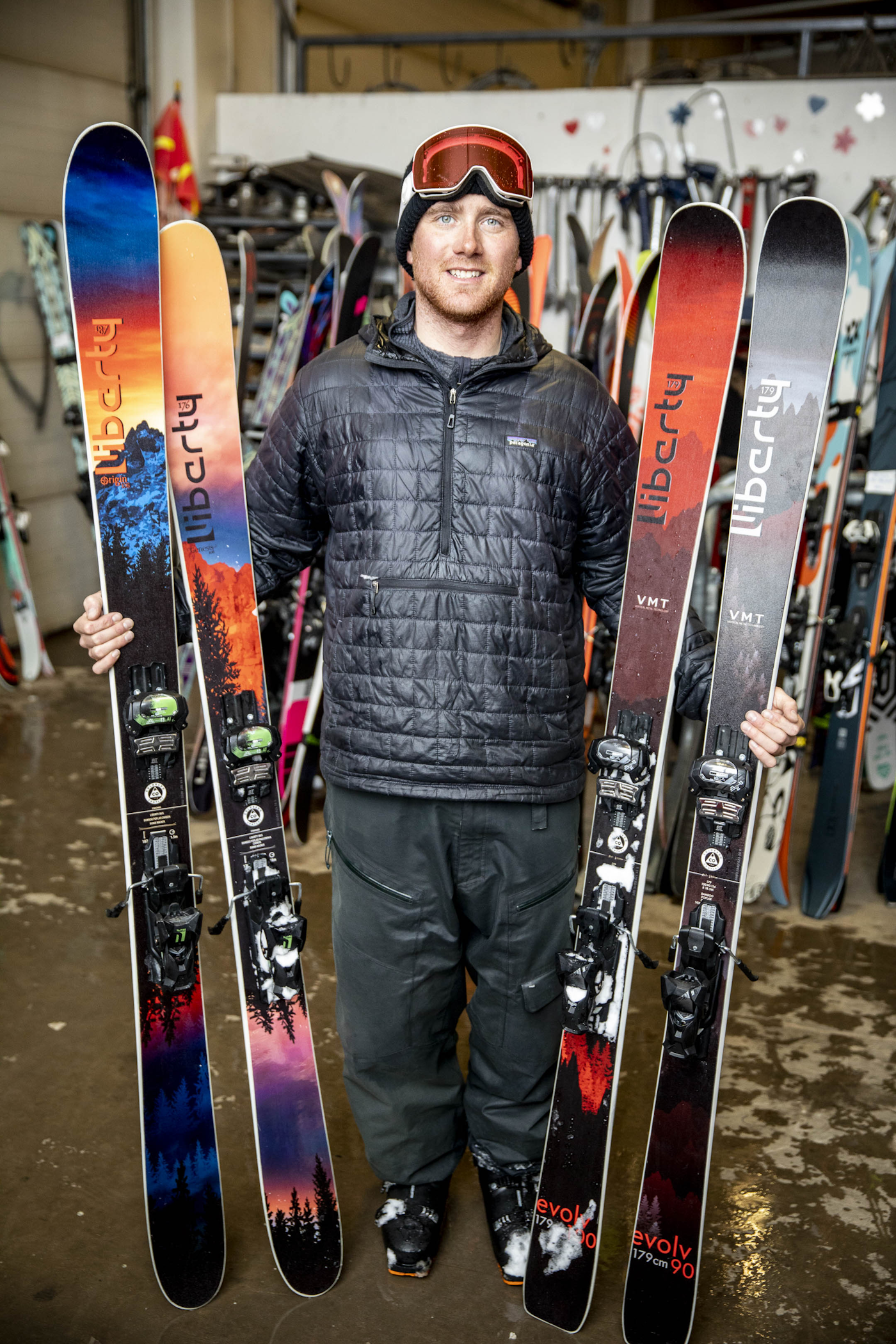 Colin Sutherland of Liberty Skis shows off, from left to right, the Origin 106, Genesis 100, and brand new Evolv100 and Evolv90.