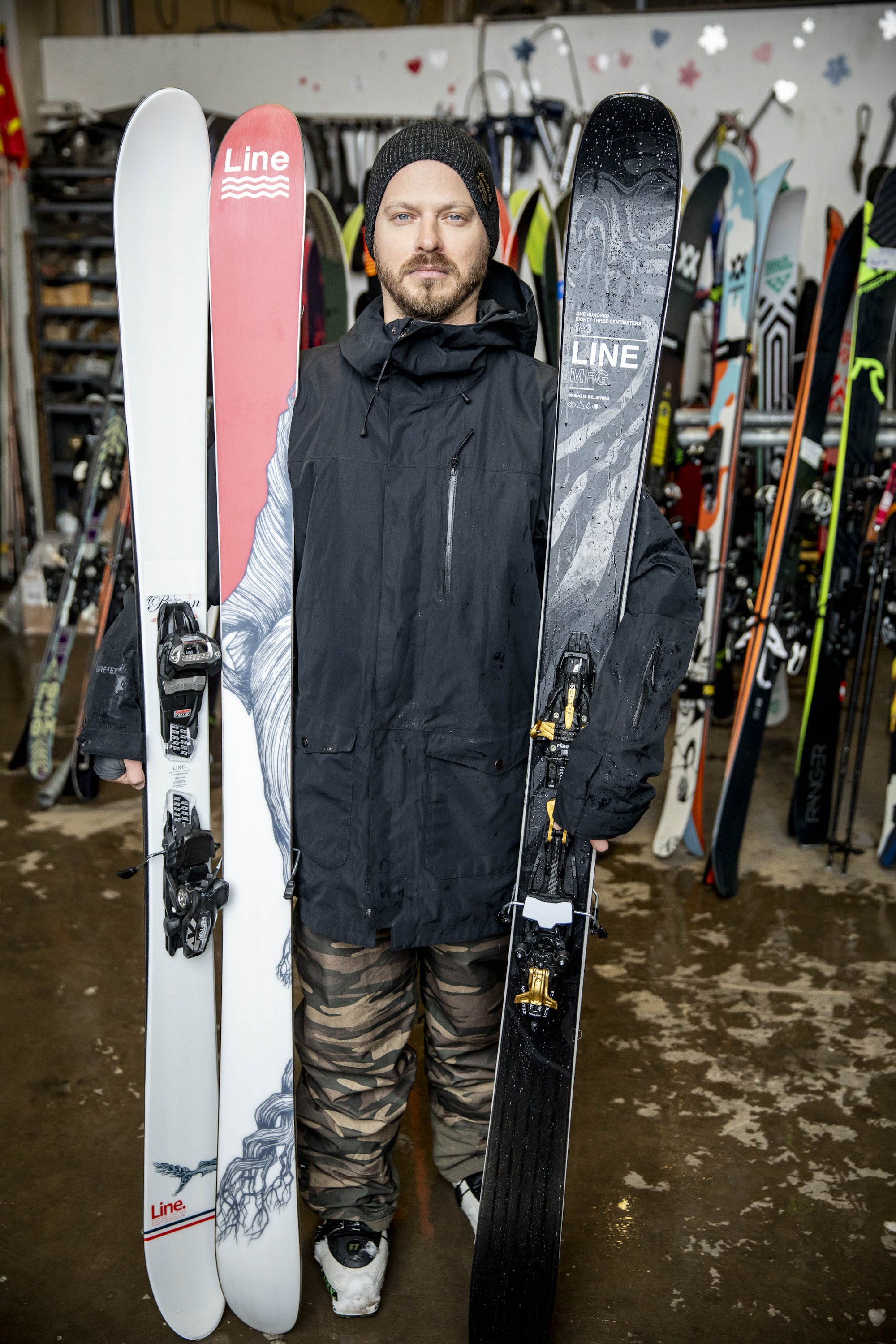 Josh Malcyk of Line Skis keeps things serious with the redesigned Sir Francis Bacon (left) and all-new Vision 108.