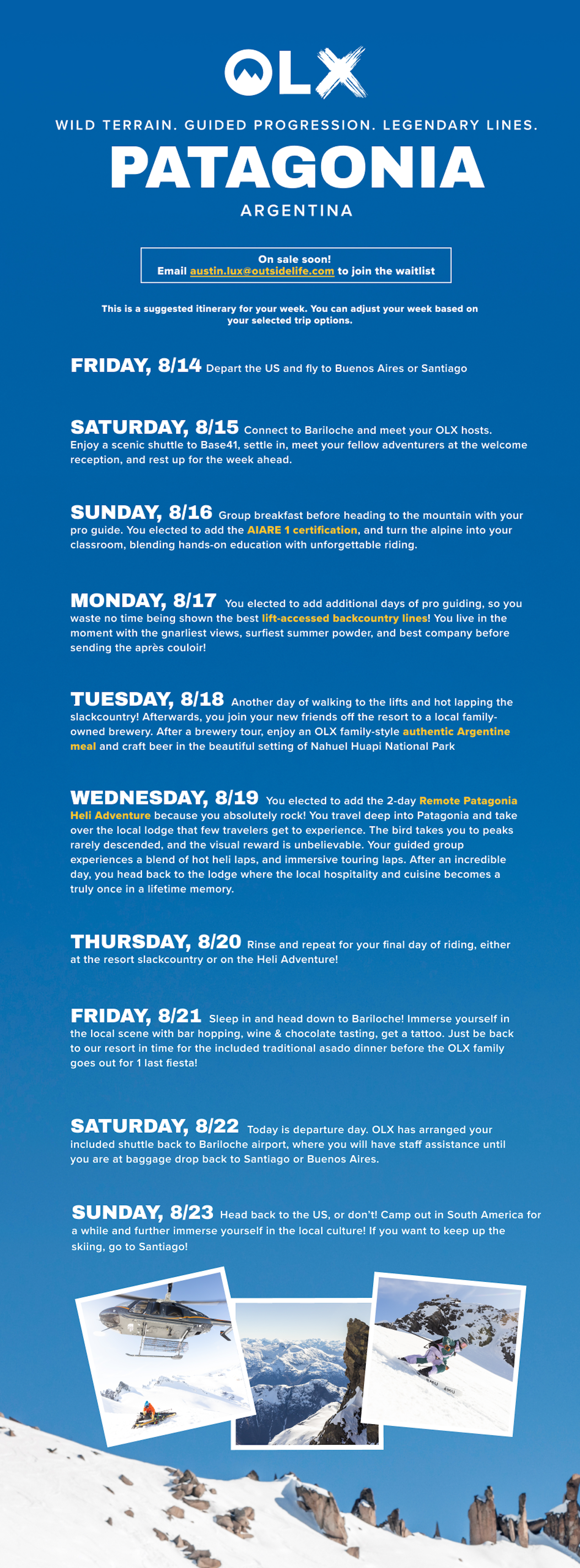 A base trip package for OLX Patagonia ($2790 VALUE!)