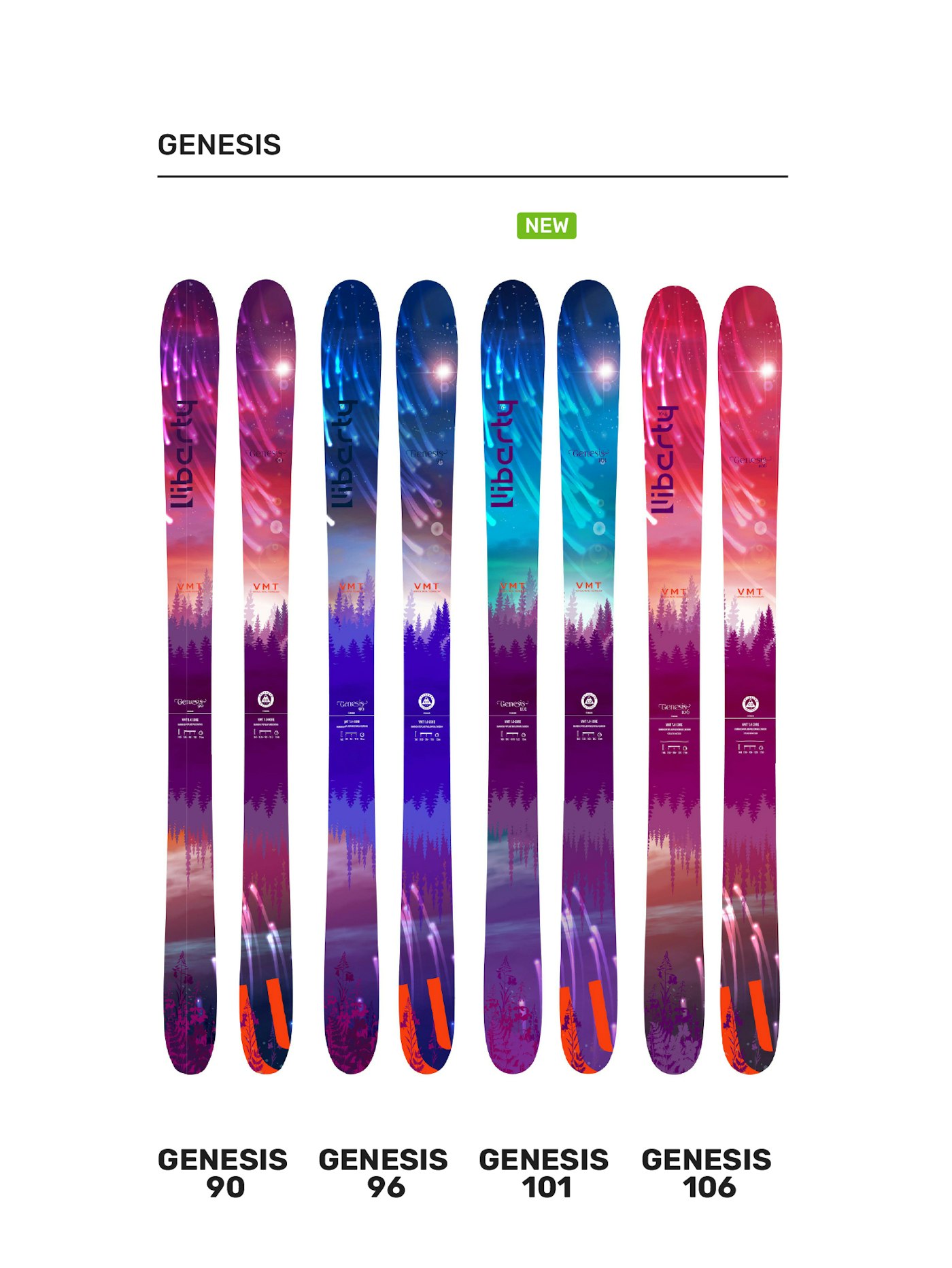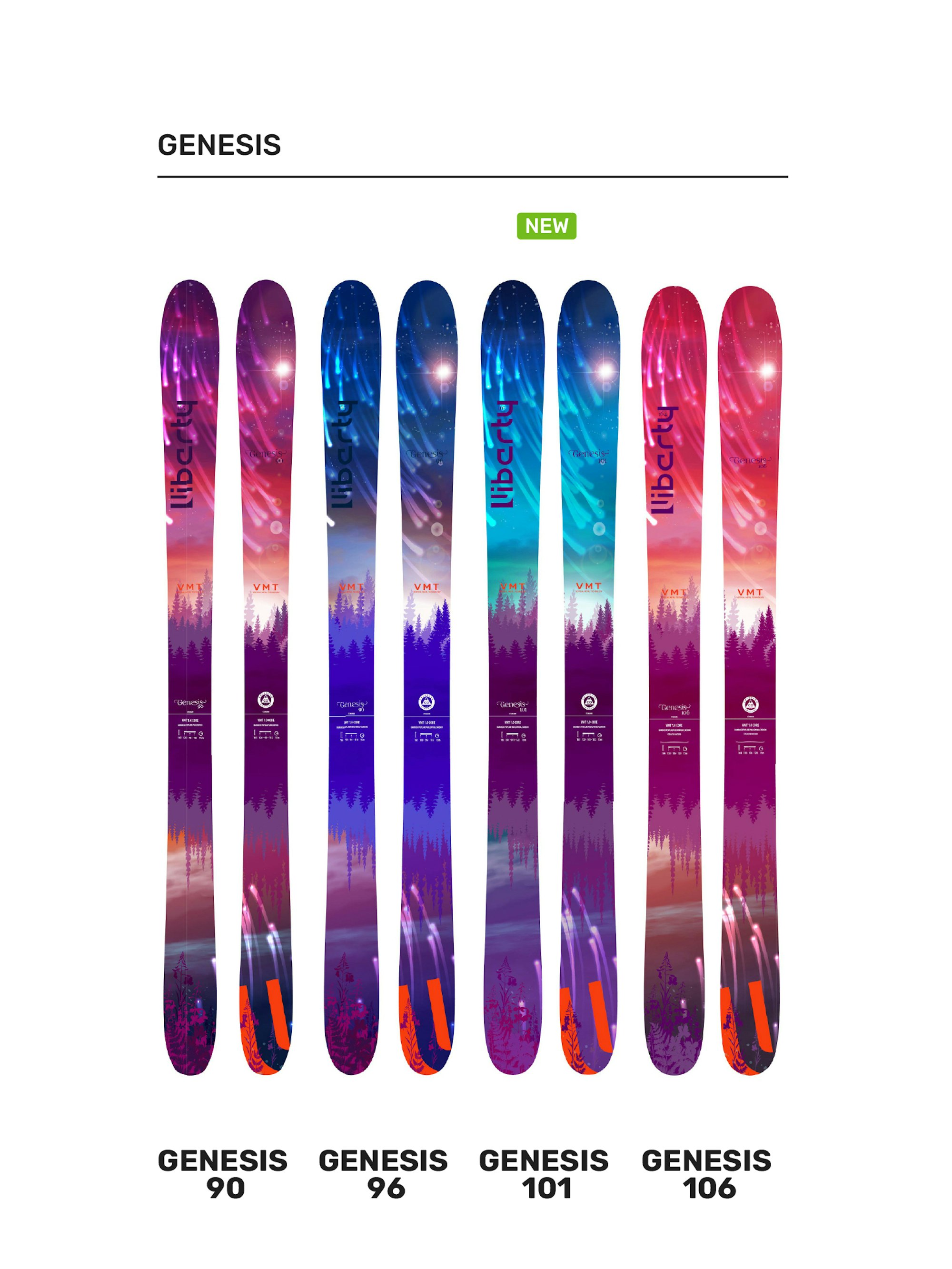 Every ski in the Genesis series now comes with an upgrade in the core, Liberty’s VMT 1.0 construction. Liberty has also added a new colored, poured, urethane sidewall that gives the Genesis increased durability and a smoother ride in a women’s freeride shape.