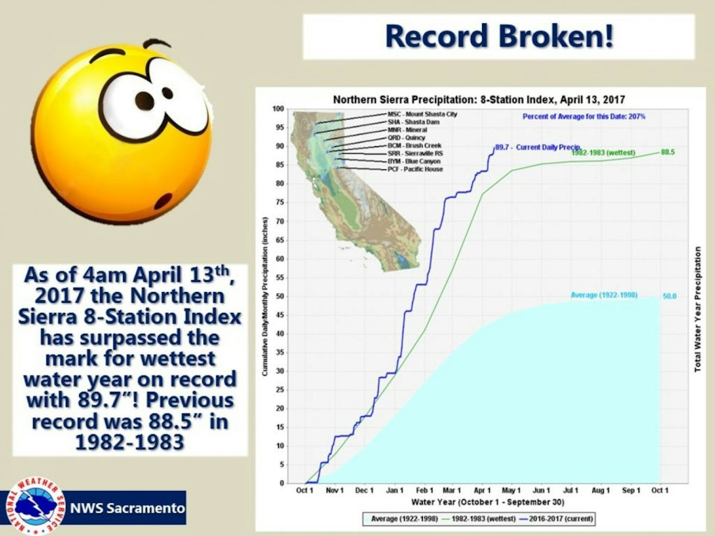 All that, and there is more weather in the forecast. I.e. the snowfall may very well continue. Regarding rainfall totals in the state, the water year began on October 1 and runs through September of this year, meaning there’s plenty of time to add to the aforementioned, record-breaking precip’ tally.