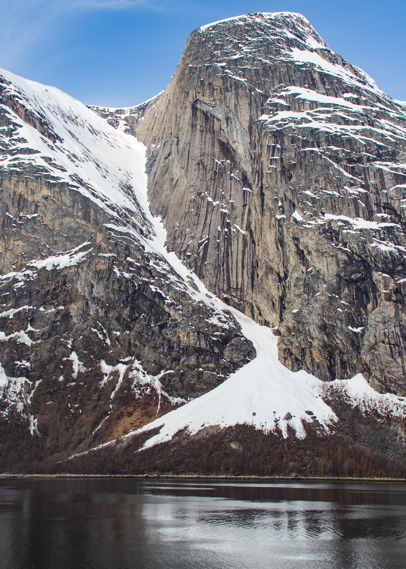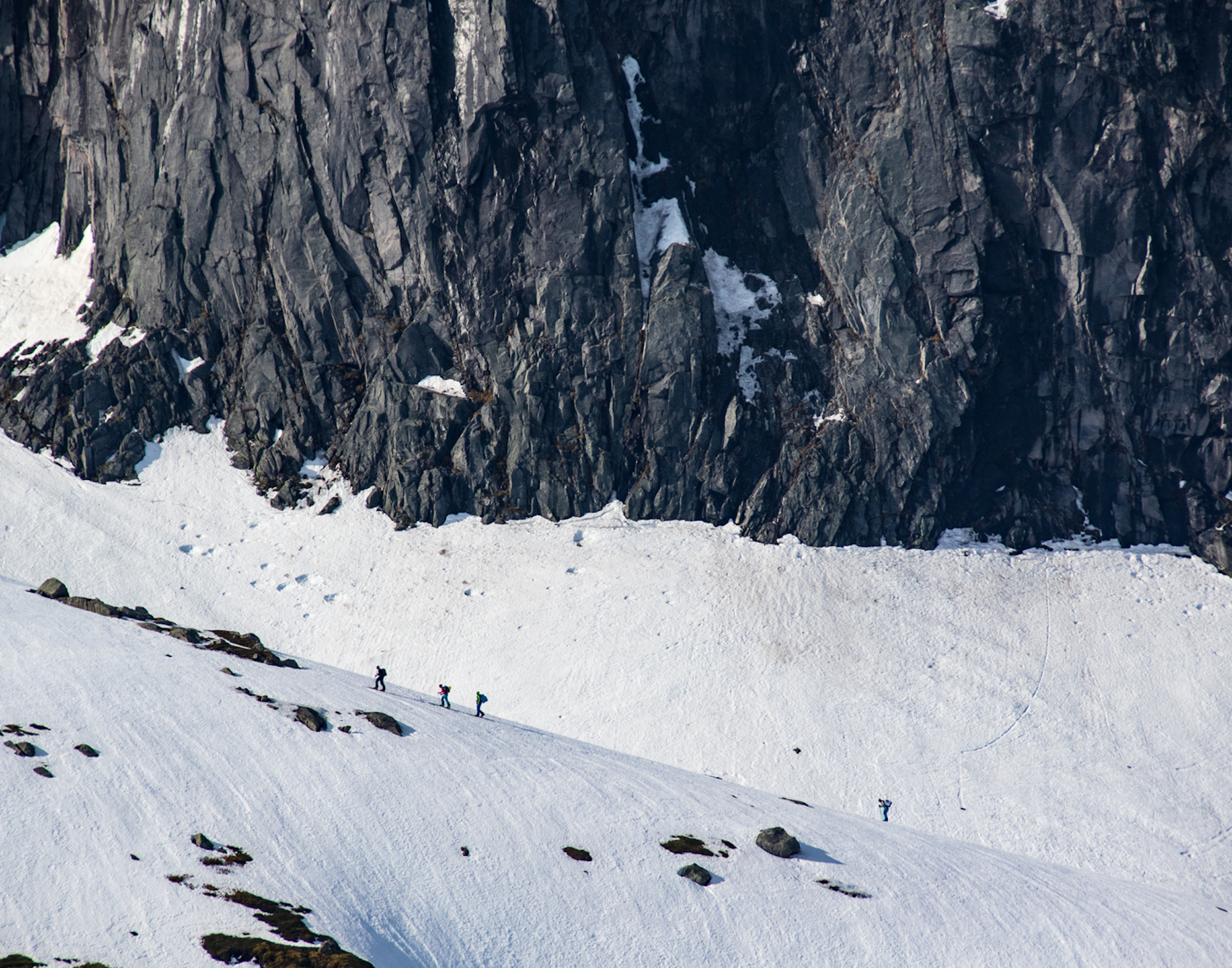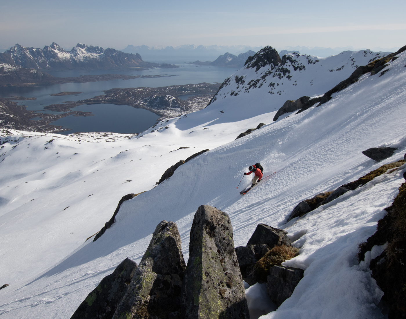 The skiing around the port town of Narvik is extraordinary. This is the mighty Gangnesaksla. The granite wall on the right guarding the line is taller than most peaks in Yosemite.