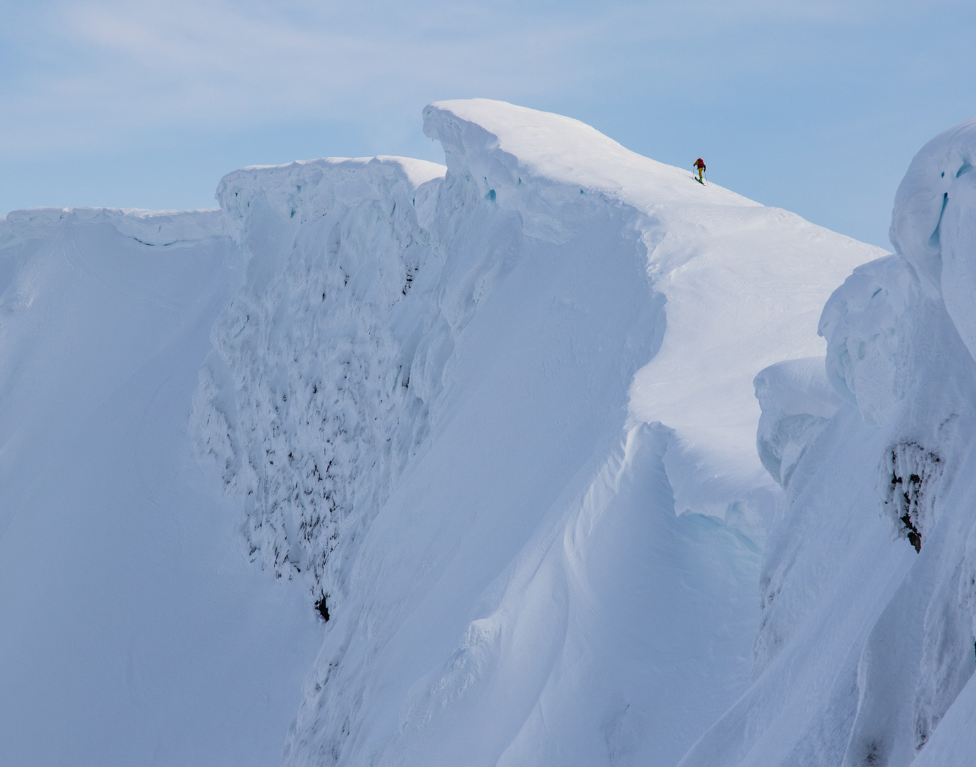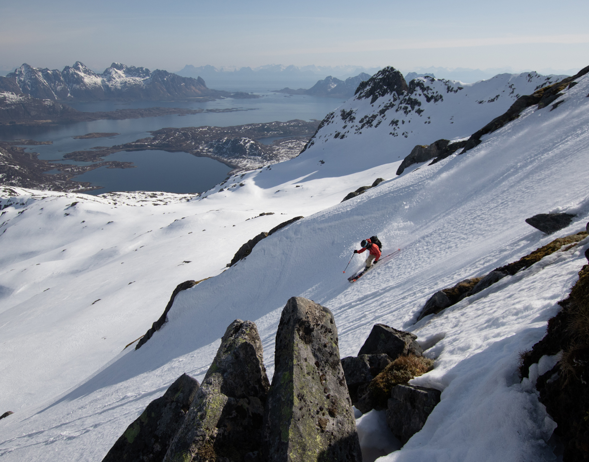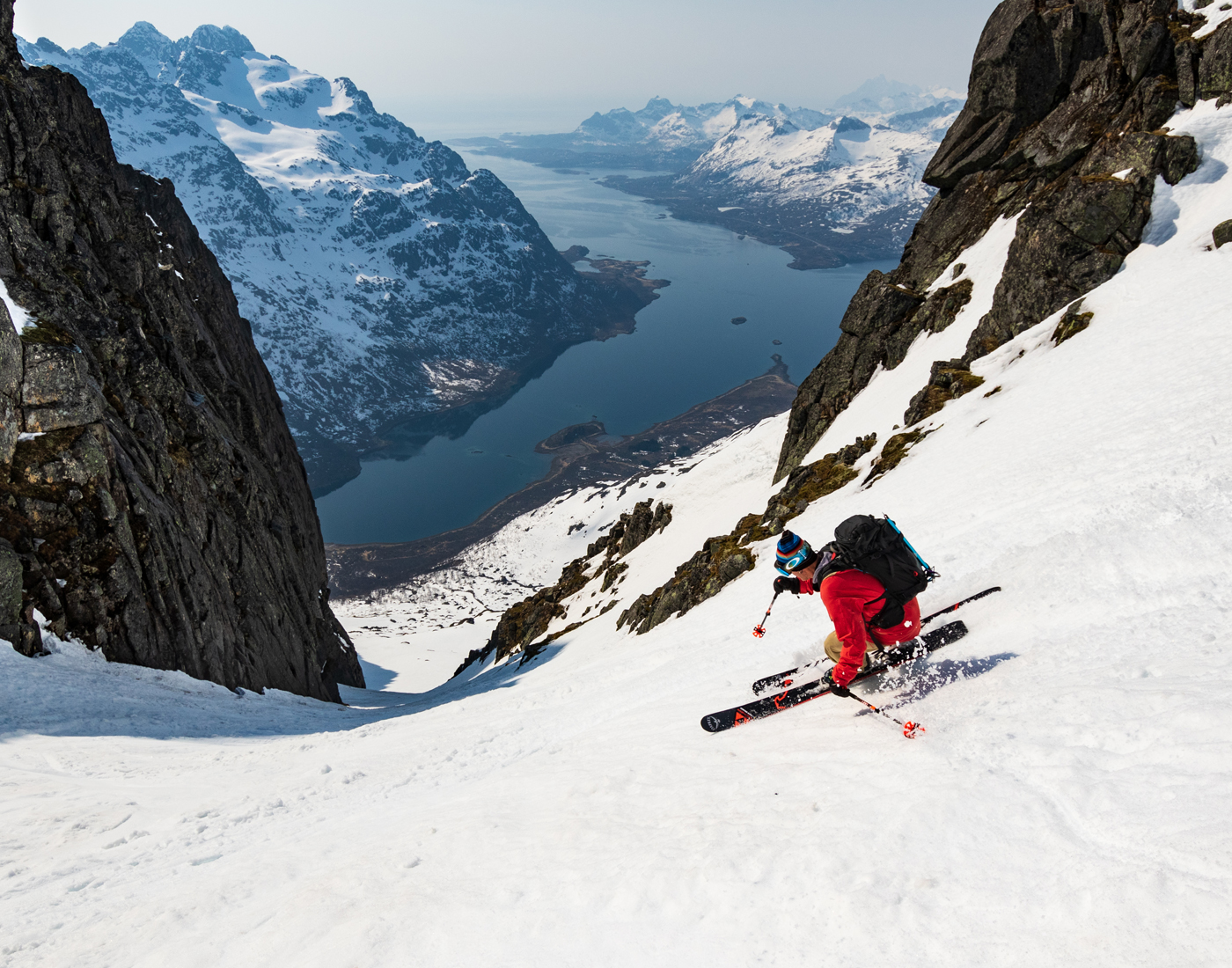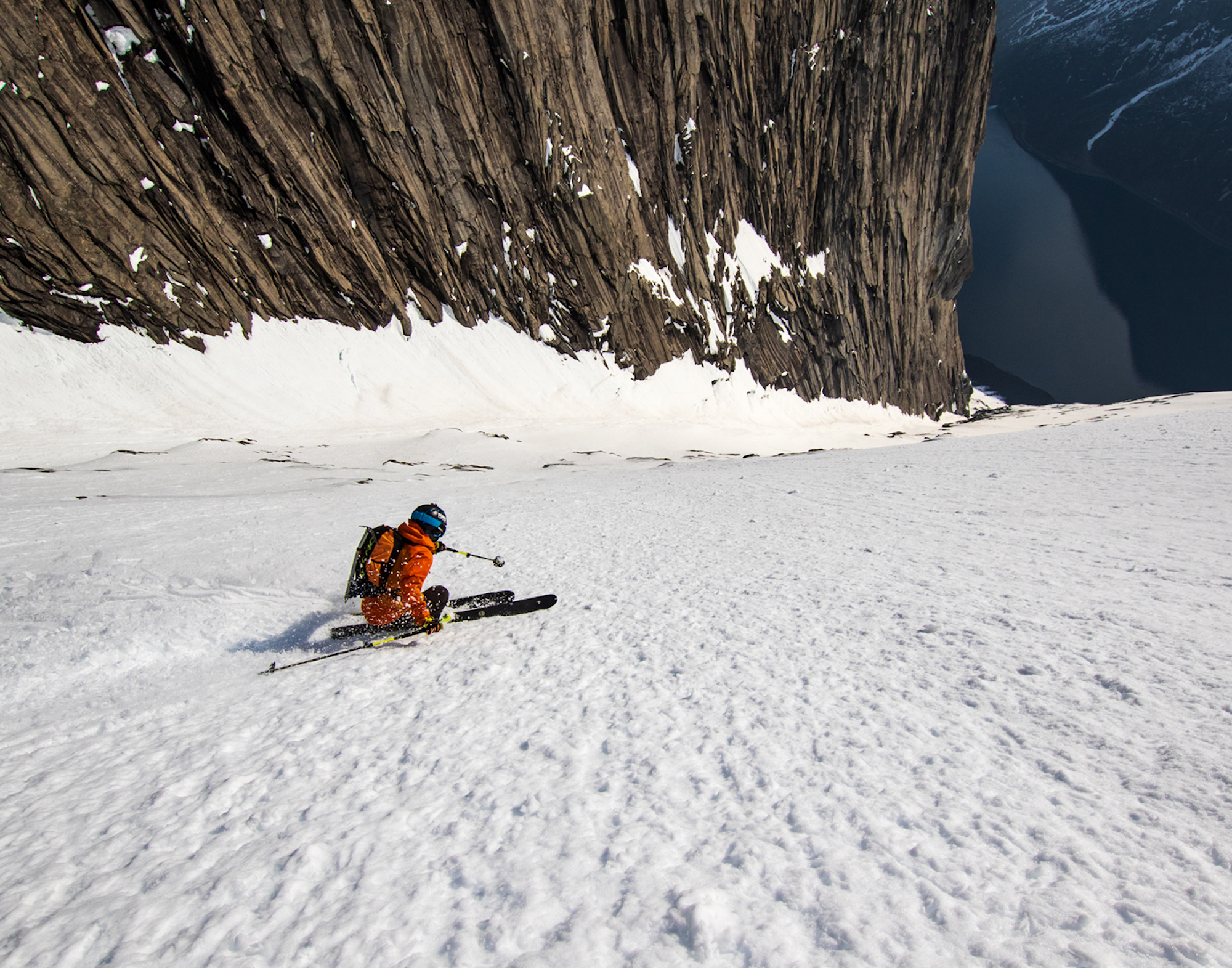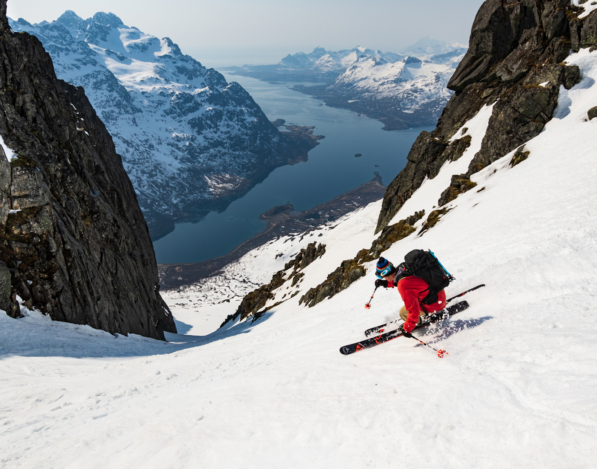 The view from inside the Gangnesaksla is pretty sporty. The line goes at a 35-40-degree pitch and 3,300 vertical straight to ocean. SKIER: Micke Ekenstam