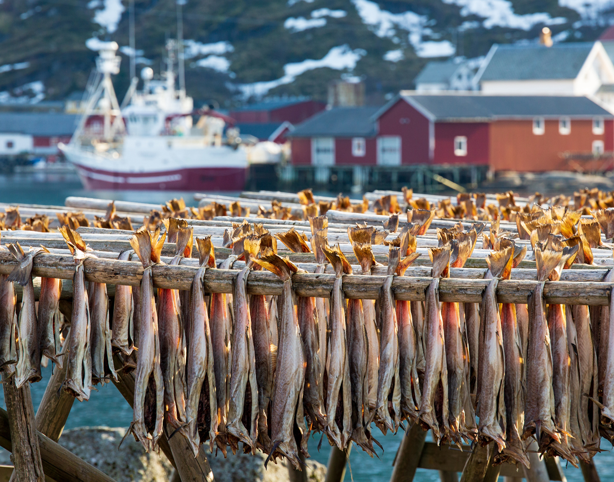 Drying Cod hang over wooden rails in the fishing town of Reine. The smell you ask? Its pretty much as bad as you might imagine.