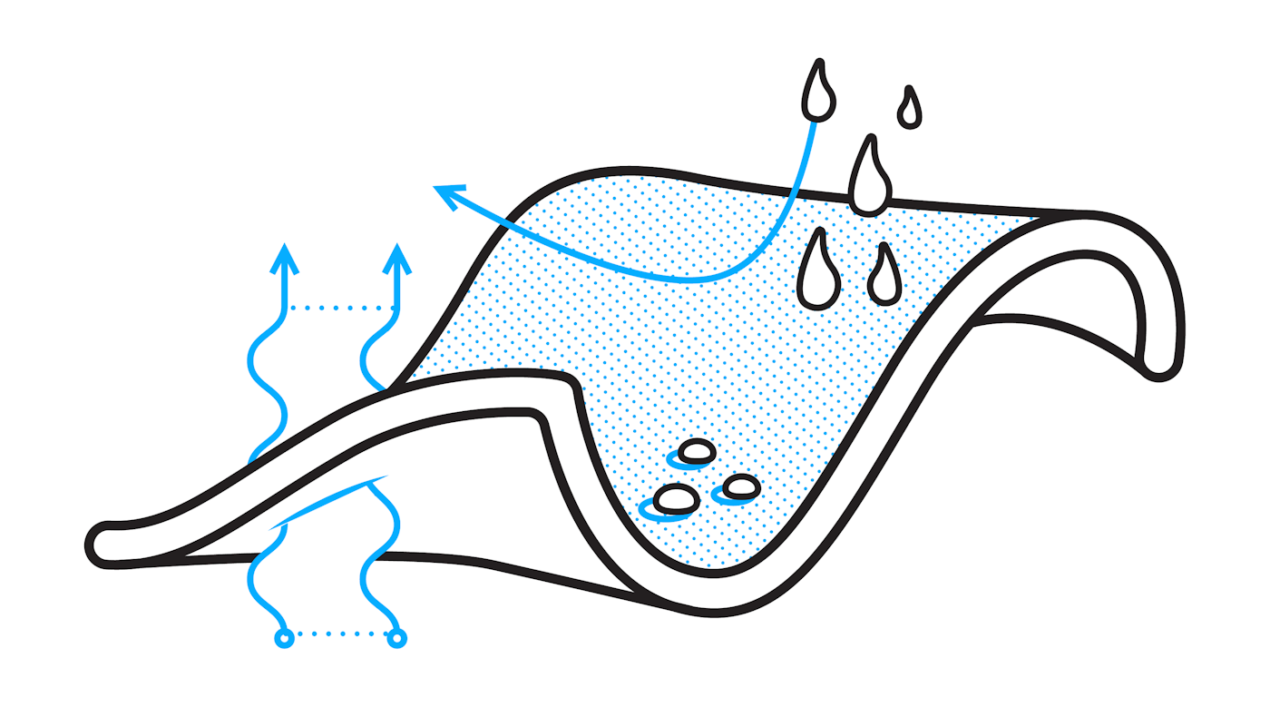 The membrane is a thin piece of technical fabric with pores that are small enough to keep water out (waterproof) but large enough to allow vapor to escape from the inside (breathable). It’s positioned between the outer layer and inner layers of fabric on a jacket. There are several prominent brands of membranes, such as Gore-Tex, Pertex and eVent, and a lot of brands have begun producing proprietary membranes for their outerwear.