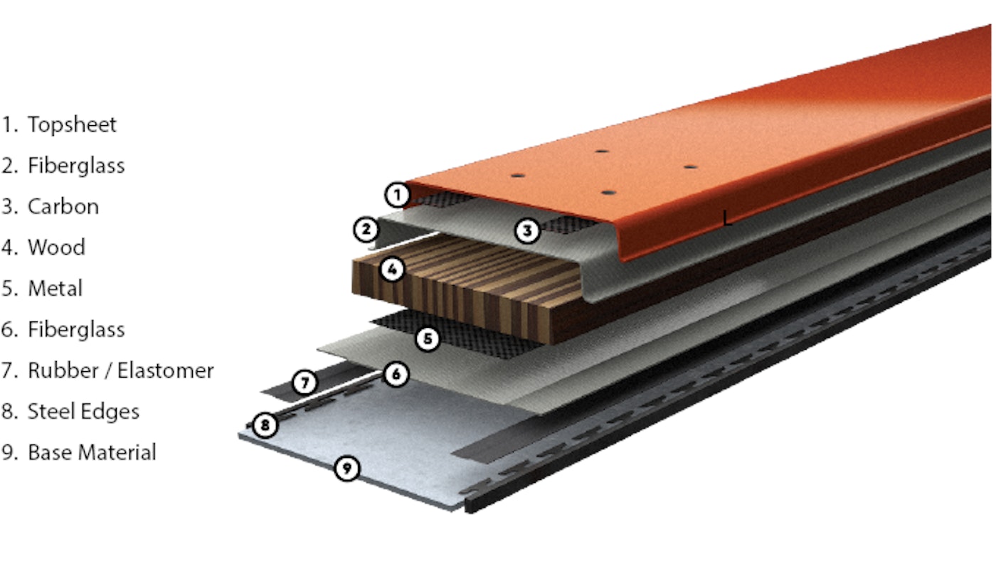 Wood: Ski cores are built with different types of wood to offer a balance of weight and durability, while carbon and metal layers add stiffness, damping, and stability.