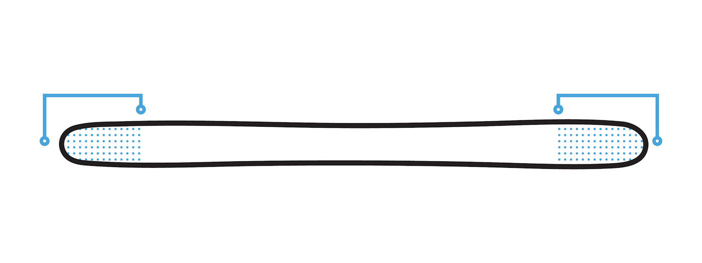 While a nice, large tip can keep a ski afloat, the downside to a wide tip or tail is that the edge can get caught up or “hook” in the snow as you work your way through a turn. To combat this, some ski tips and tails are tapered, meaning the widest part of the tip or tail is slightly closer to the center of the ski, reducing the effective edge, as well as the chance of catching on the snow when you don’t want it to.
