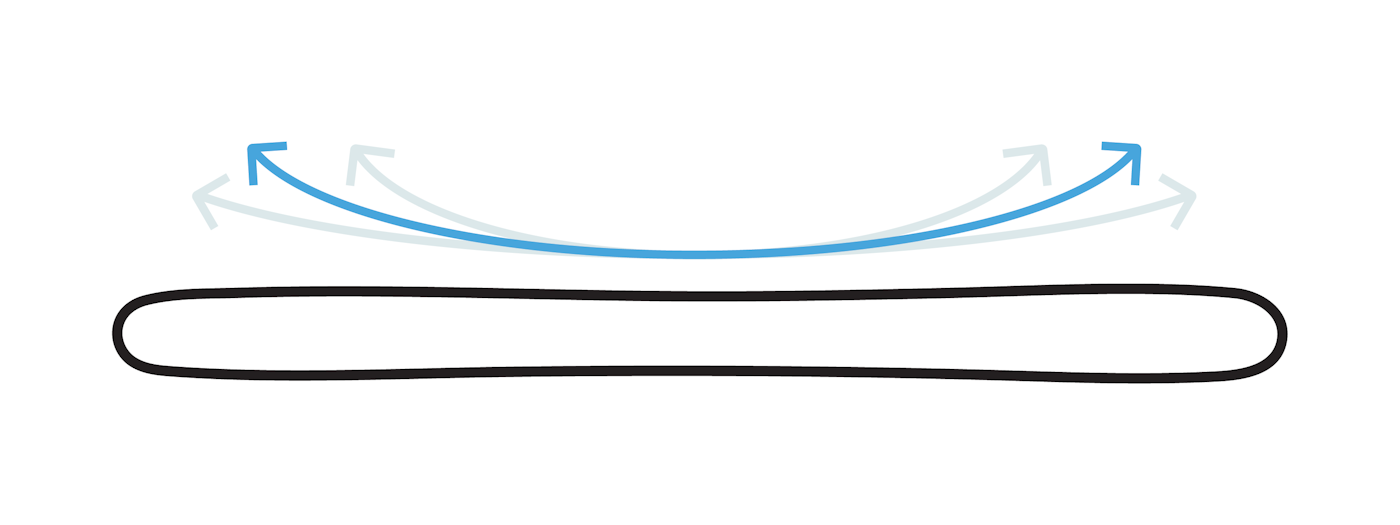 Rocker, or reverse camber, is when a ski arches upward and away from the snow. It’s most commonly found in the tips and tails of modern skis, though some powder skis are fully-rockered. This design enhances flotation in powder and eases turn initiation which generally leads to a looser, more playful feel.
