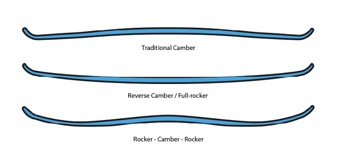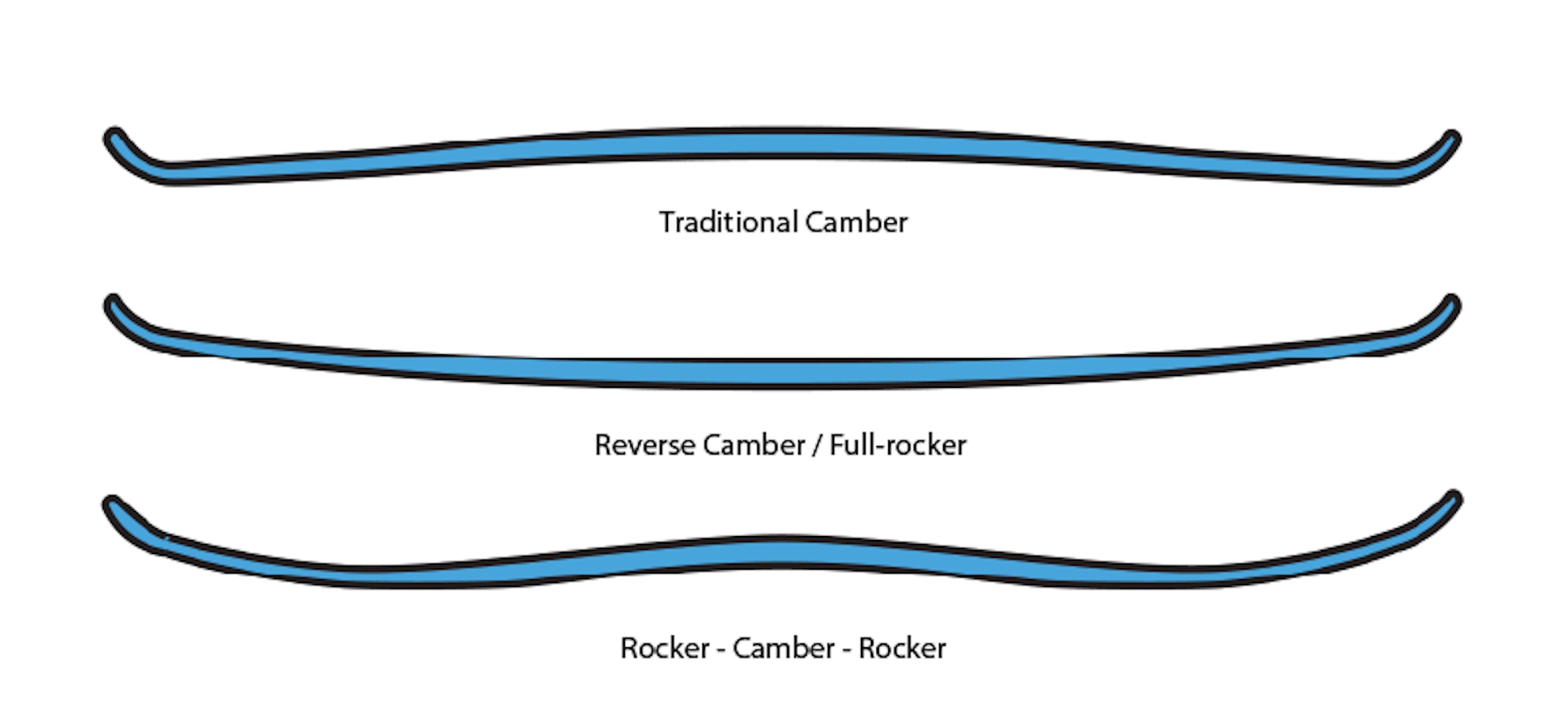 Many modern skis use a combination of camber and rocker for versatility. Camber refers to the arch of a ski when placed on a flat surface. When a skier pressures the ski into a turn, the weight is distributed throughout the cambered section of a ski, creating an effective edge which then carves through the snow.