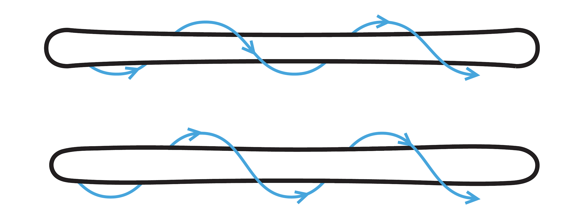The distance between the center and perimeter of a circle is the radius. In theory, if you were to ski a perfect circle around a center point using a handful of different ski models, you’d get several circles of varying sizes. A ski’s sidecut and stiffness establish the size of its circle. Stiffer materials combined with less sidecut yield a larger turn radius, or a larger circle; softer materials and deeper sidecut create the opposite.