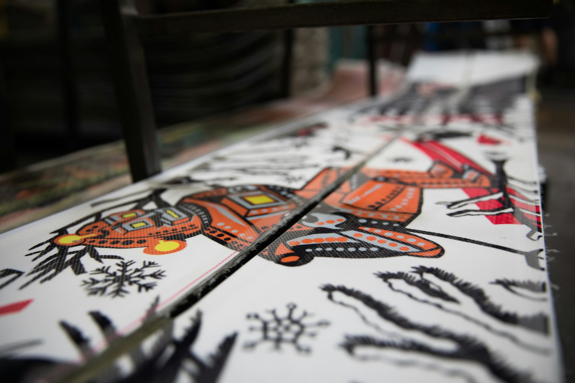 It’s always cool to be working on something like a ski, which has an interesting form. You’re working with this stretched out plane; it’s just a canvas with a different shape than usual. I do the same thing in my printmaking, too, working with odd-shaped blocks and conceptualizing a design for something that’s not a typical print format.