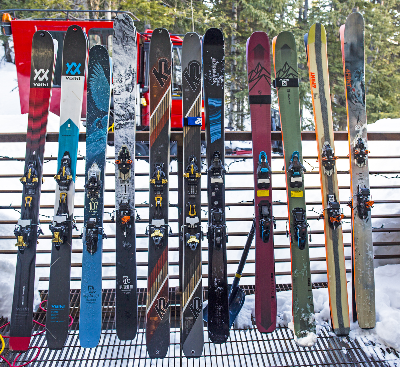 From left to right: Völkl V-Werks Mantra and VTA 108; Icelantic Mystic 107 and Natural 111; K2 Wayback 96 and Wayback 106; Armada Tracer 98; Salomon Stella 106 and QST 106; 4FRNT Raven and Hoji