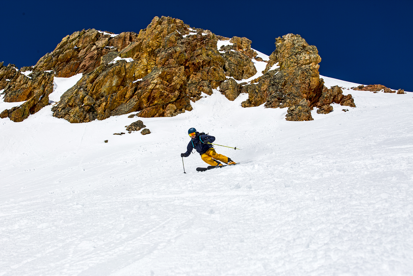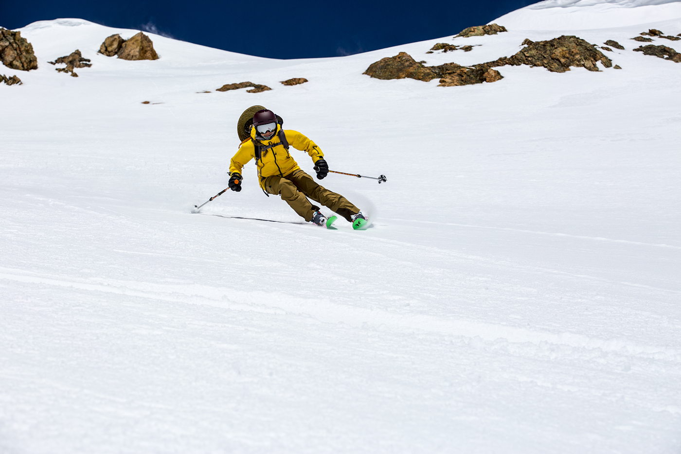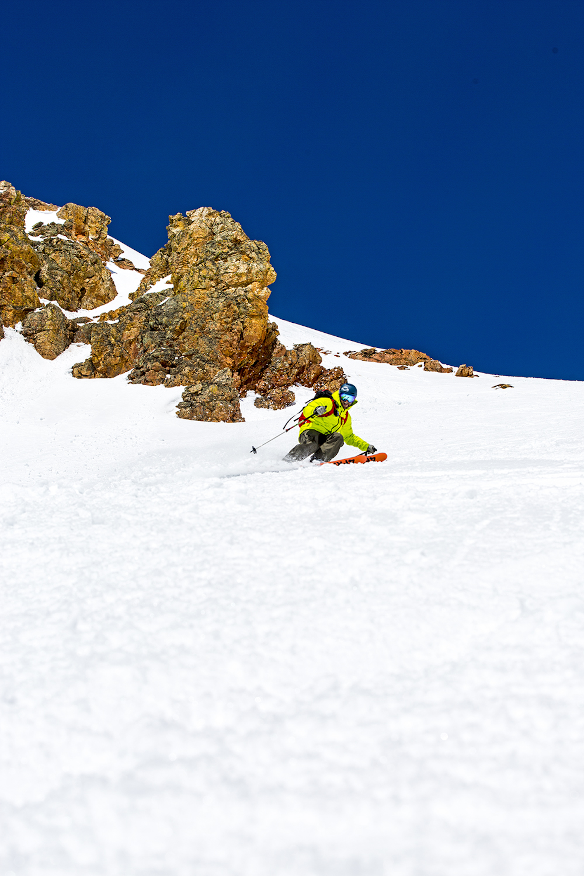 Thirteen brands provided our testers with planks, including 4FRNT, Armada, Atomic, Blizzard, DPS, Fischer, Faction, G3, Icelantic, K2, Line, Salomon and Völkl. Our testers were kitted out in POC’s Obex SPIN helmets, along with Fovea and Orb goggles, both outfitted with the brand’s clarity lenses. With the sun as bright and high as it was today, we needed ’em. Testers utilized G3’s Alpinist+ Universal and Glide skins, which aided our climbing in snow conditions that ranged from frozen wind-board to afternoon slush.