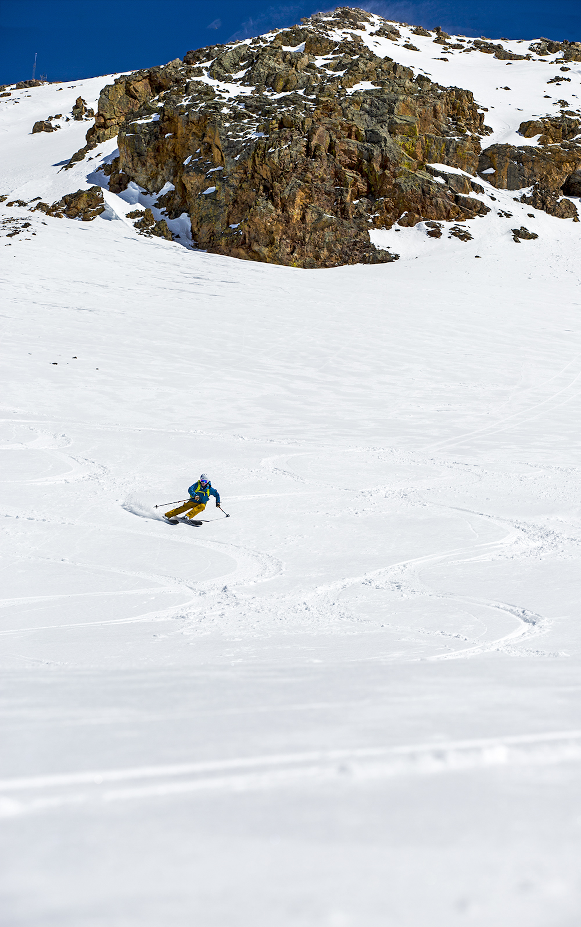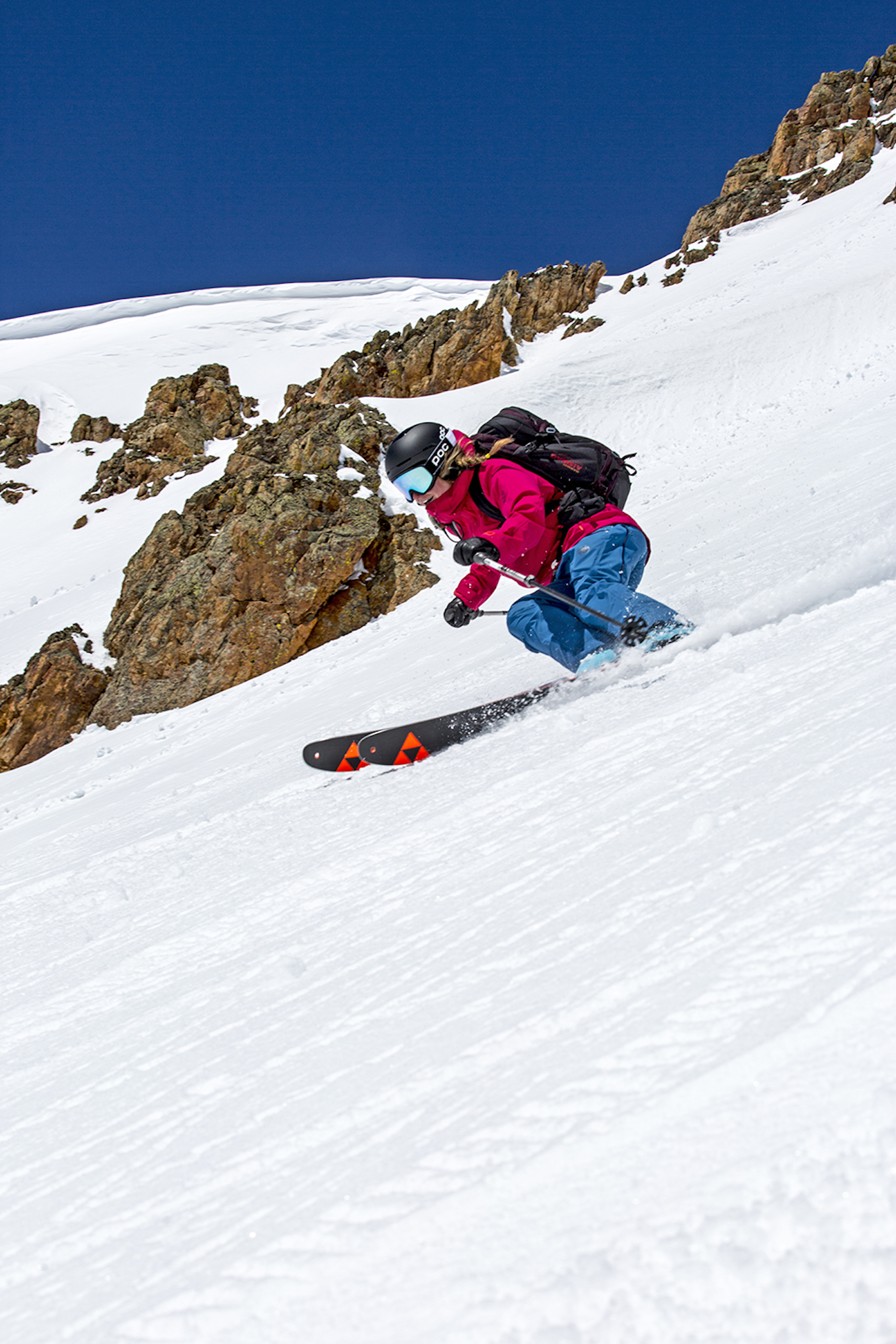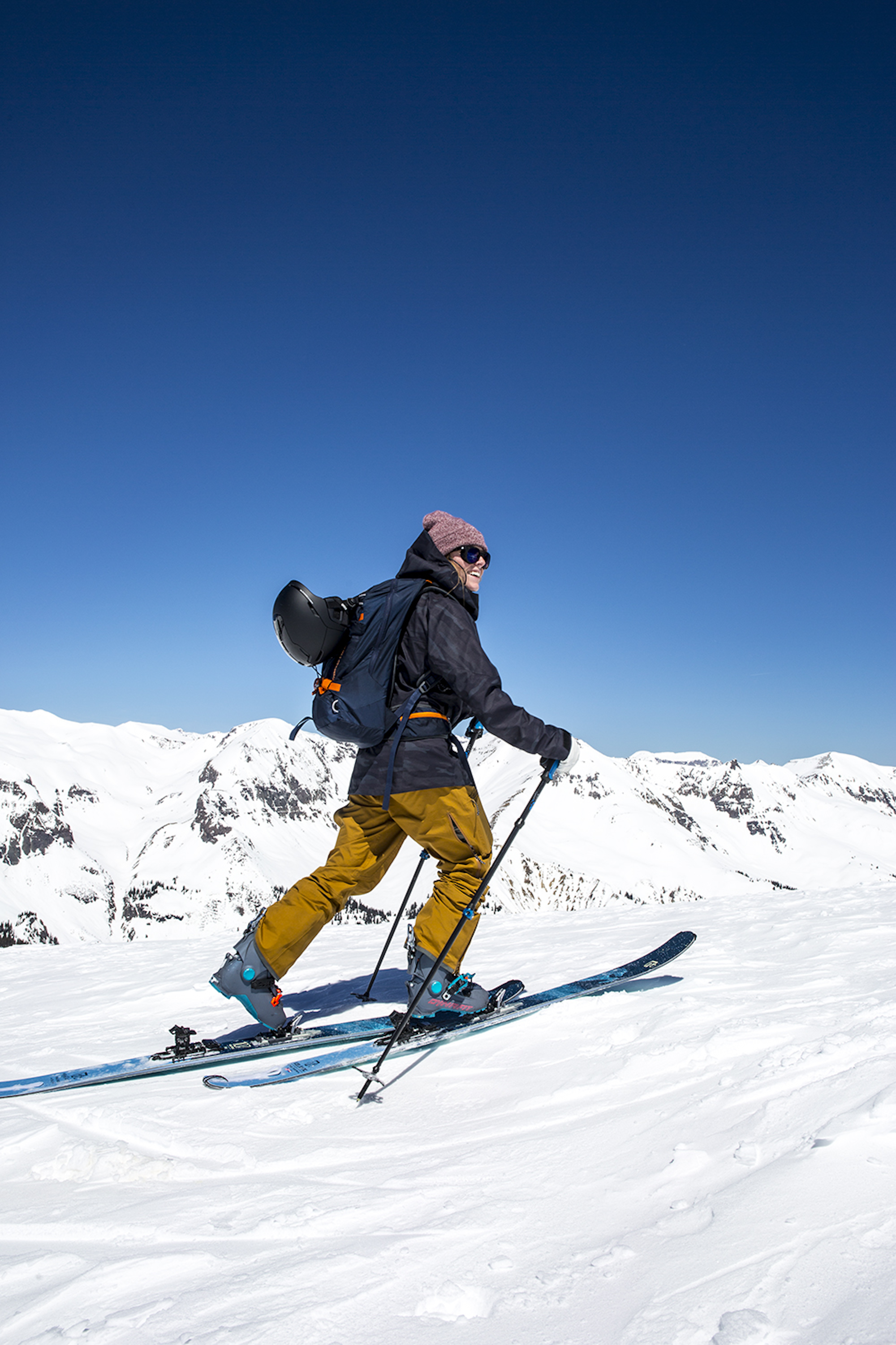 Thirteen brands provided our testers with planks, including 4FRNT, Armada, Atomic, Blizzard, DPS, Fischer, Faction, G3, Icelantic, K2, Line, Salomon and Völkl. Our testers were kitted out in POC’s Obex SPIN helmets, along with Fovea and Orb goggles, both outfitted with the brand’s clarity lenses. With the sun as bright and high as it was today, we needed ’em. Testers utilized G3’s Alpinist+ Universal and Glide skins, which aided our climbing in snow conditions that ranged from frozen wind-board to afternoon slush.