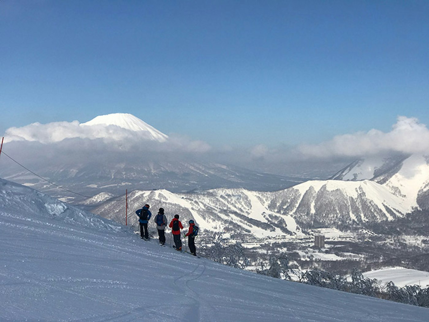 Our guide (pictured on the far right) points out a neighboring ski area with Mt. Yotei pictured to the left.