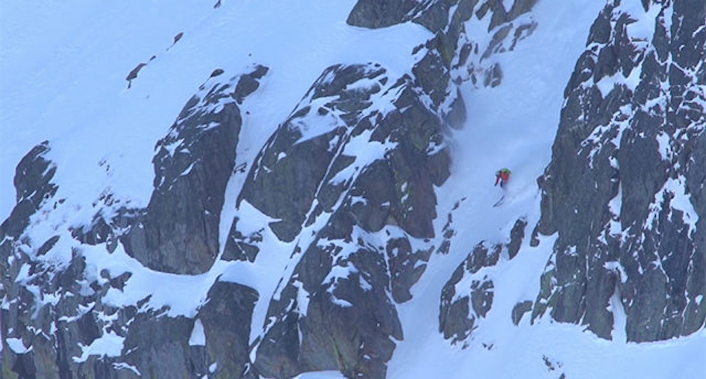 “[The couloir] has a steep, exposed entrance. A fall here would most likely be fatal,” Daiek describes. “Your first 10 turns are on a 45- to 50-degree slope in a certain ‘you fall you die’ type of zone. This wouldn’t bother me too much except for the fact that the snow was variable with patches of boiler plate ice and hidden sharks under the thin snow cover.