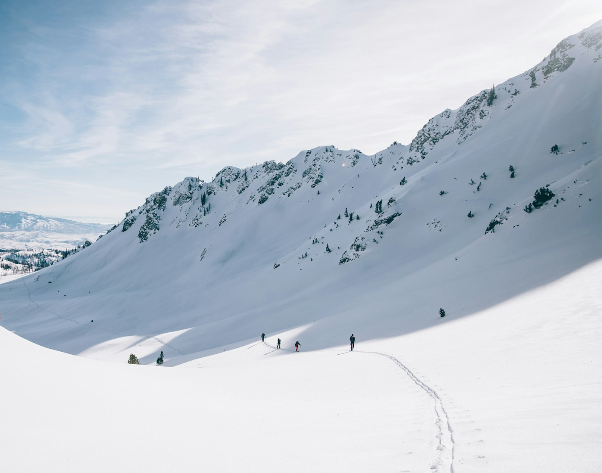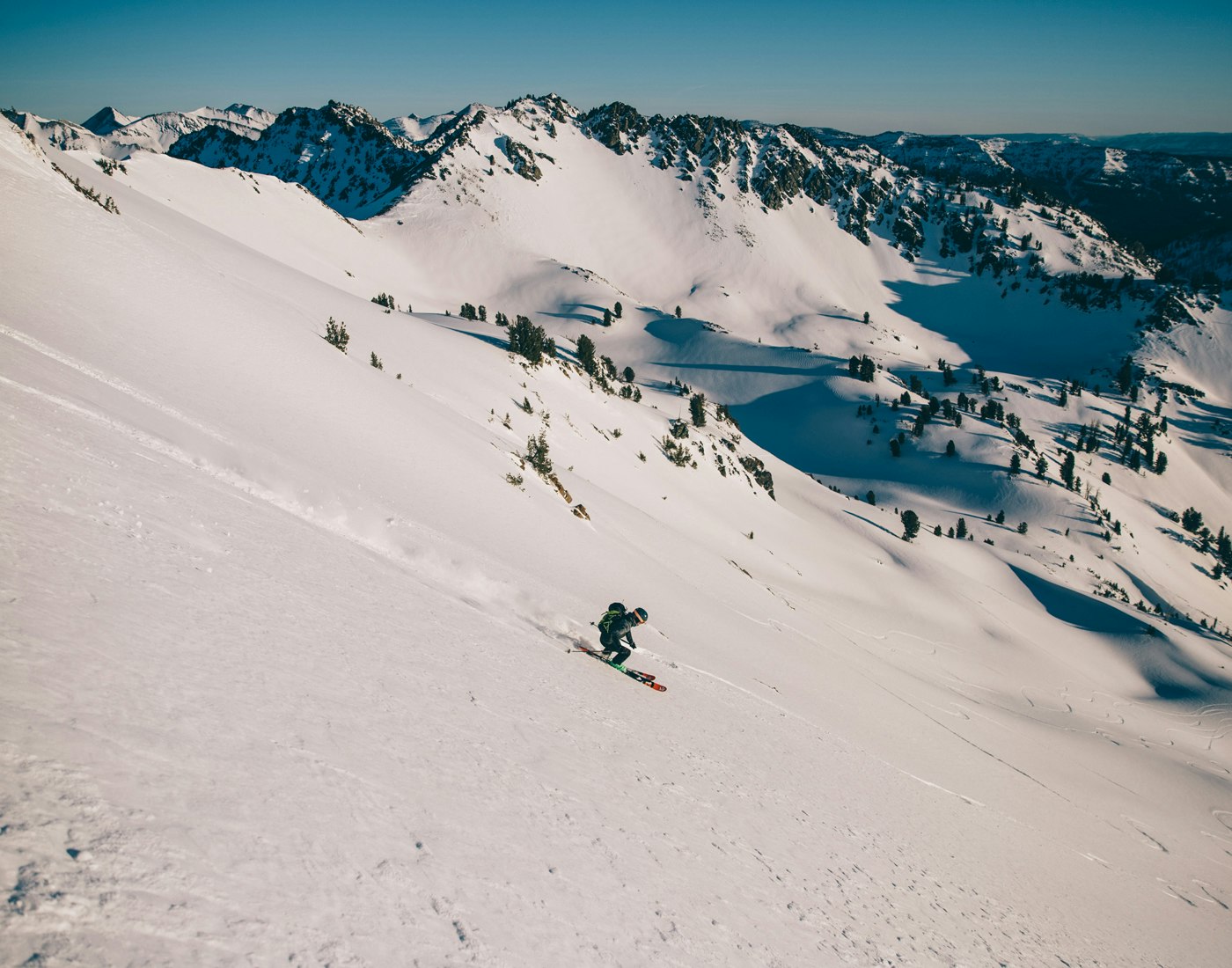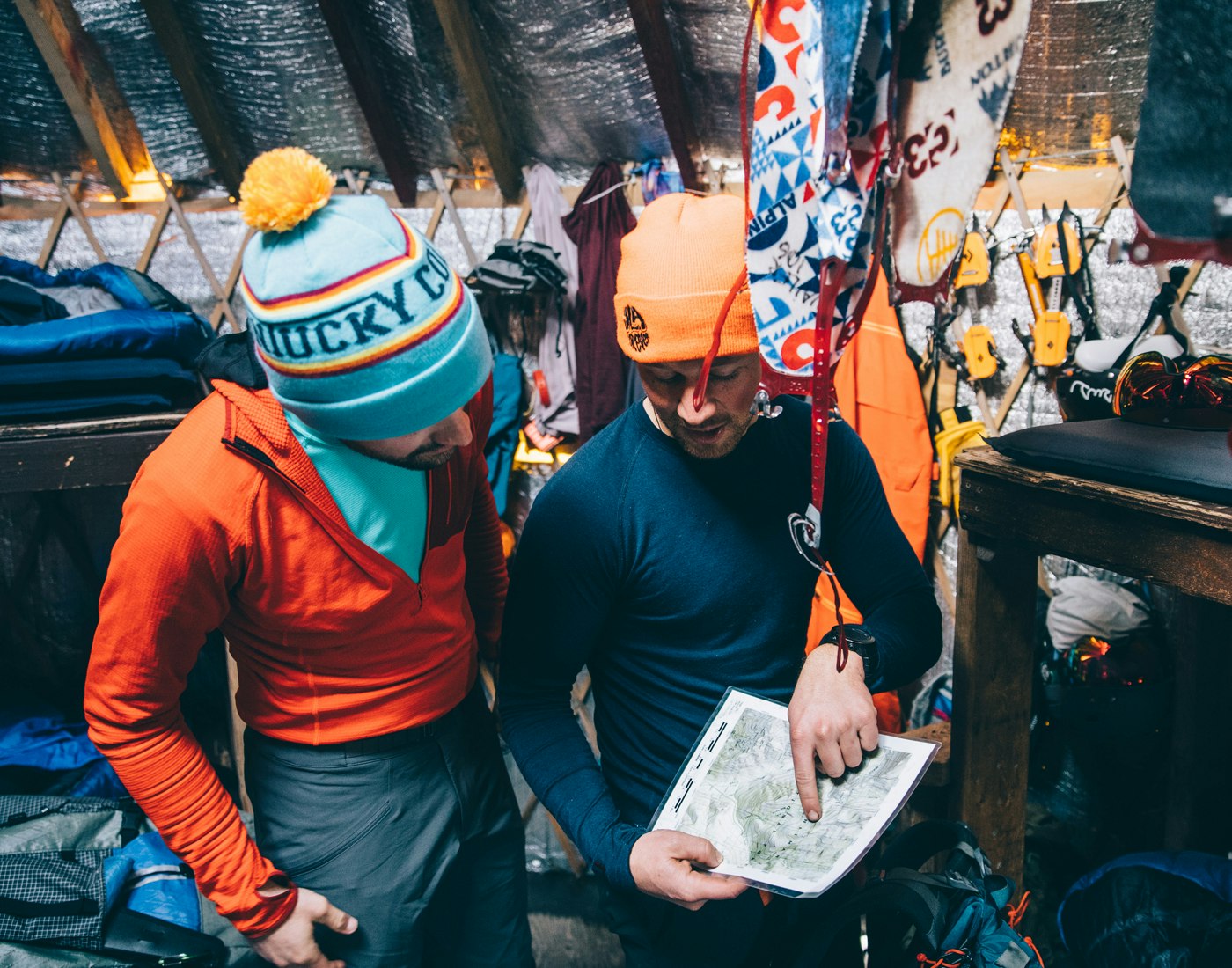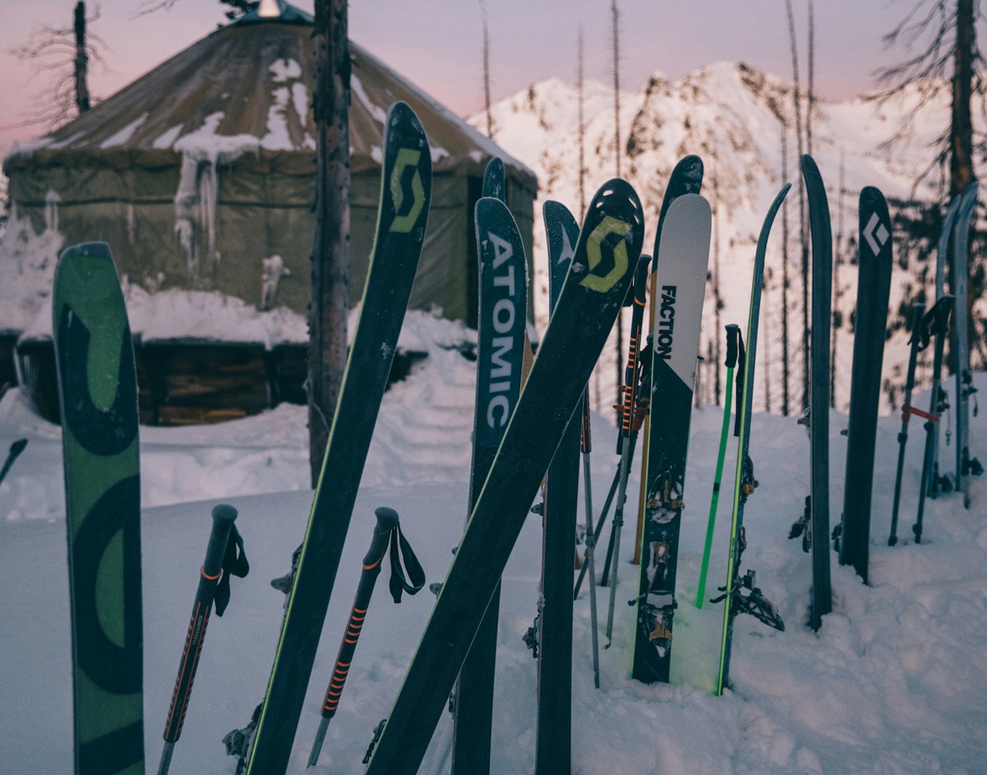 The yurt has two stories. A big kitchen loaded with cast iron pans and over-sized propane stoves sits on the lower floor, with lounge chairs, a wood stove and a topographic map of the surrounding area to use for route-finding. Upstairs, there are bunk beds for twelve and space to stash all the gear you’d ever need to bring on a backcountry mission. Outside, you’ll find some of the most versatile terrain in the country, a mix of glades, trees and jaw-dropping peaks.