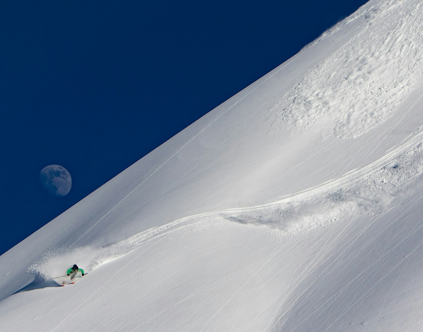 Slemett bangs a left turn in front of the moon in Alaska. Photo: Frank Shine