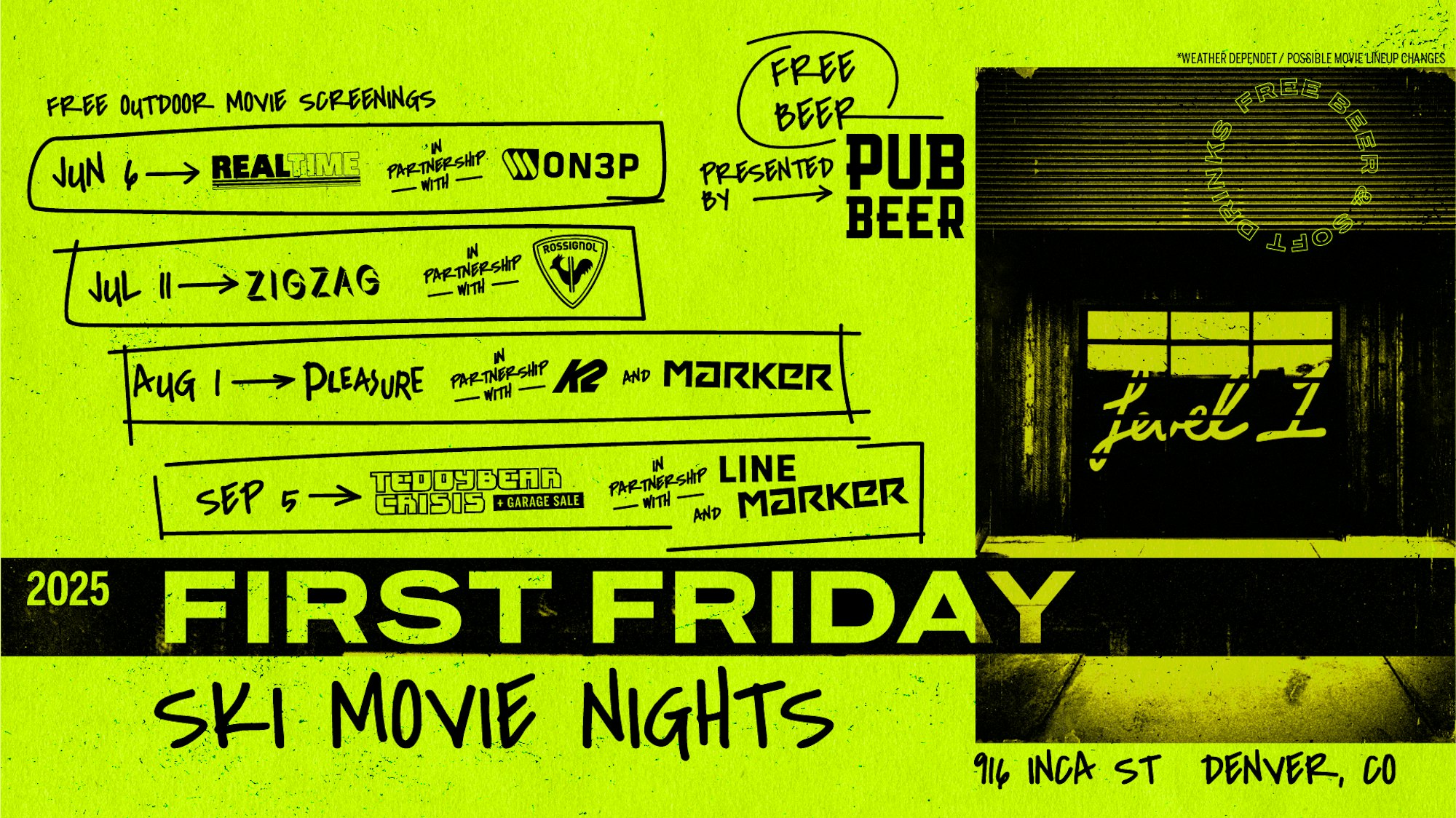 Throughout summer 2025, you can swing by the Level 1 worldwide headquarters in the Santa Fe Art District of Denver, Colorado on the first Friday of every month starting June 6. The team has organized a grand lineup of legendary ski films in partnership with some of the brands on the market. It’s free to attend, and Pub Beer by 10 Barrel Brewing Co. is generously supplying free beer. Does it get any better?