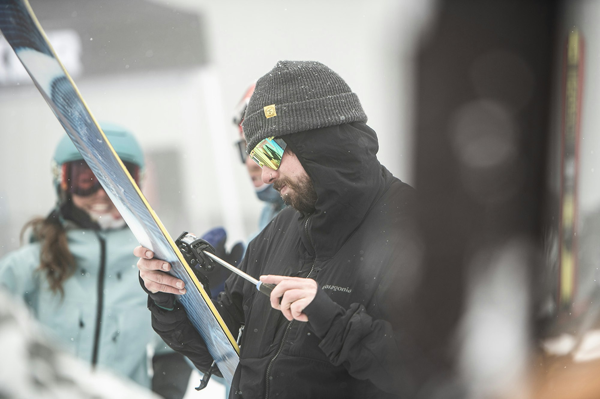 J Skis’ Taylor Bibaud preps a ski for one of our testers. Photo: Laura Obermeyer
