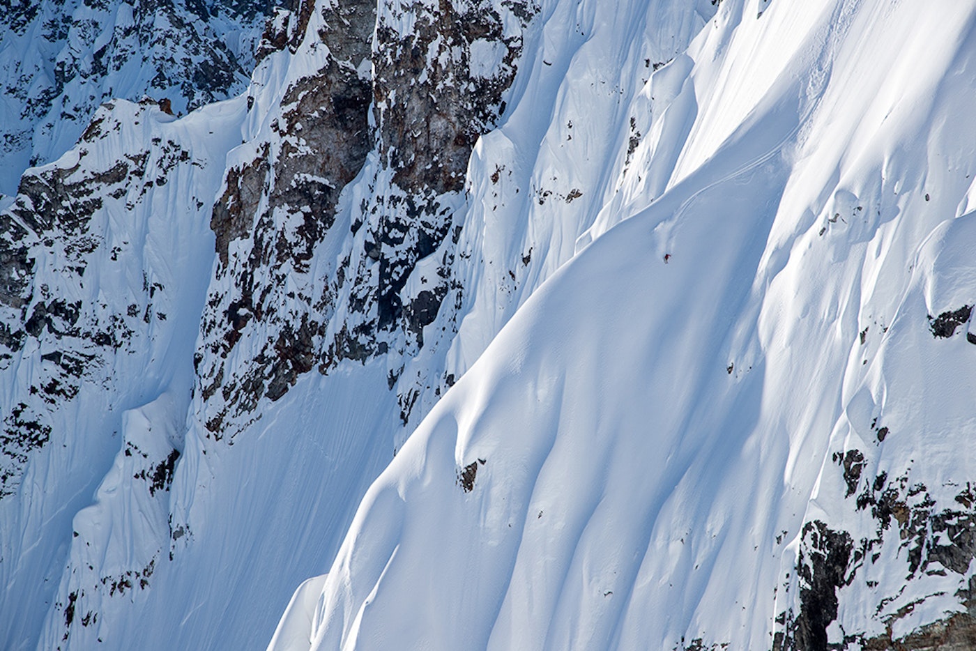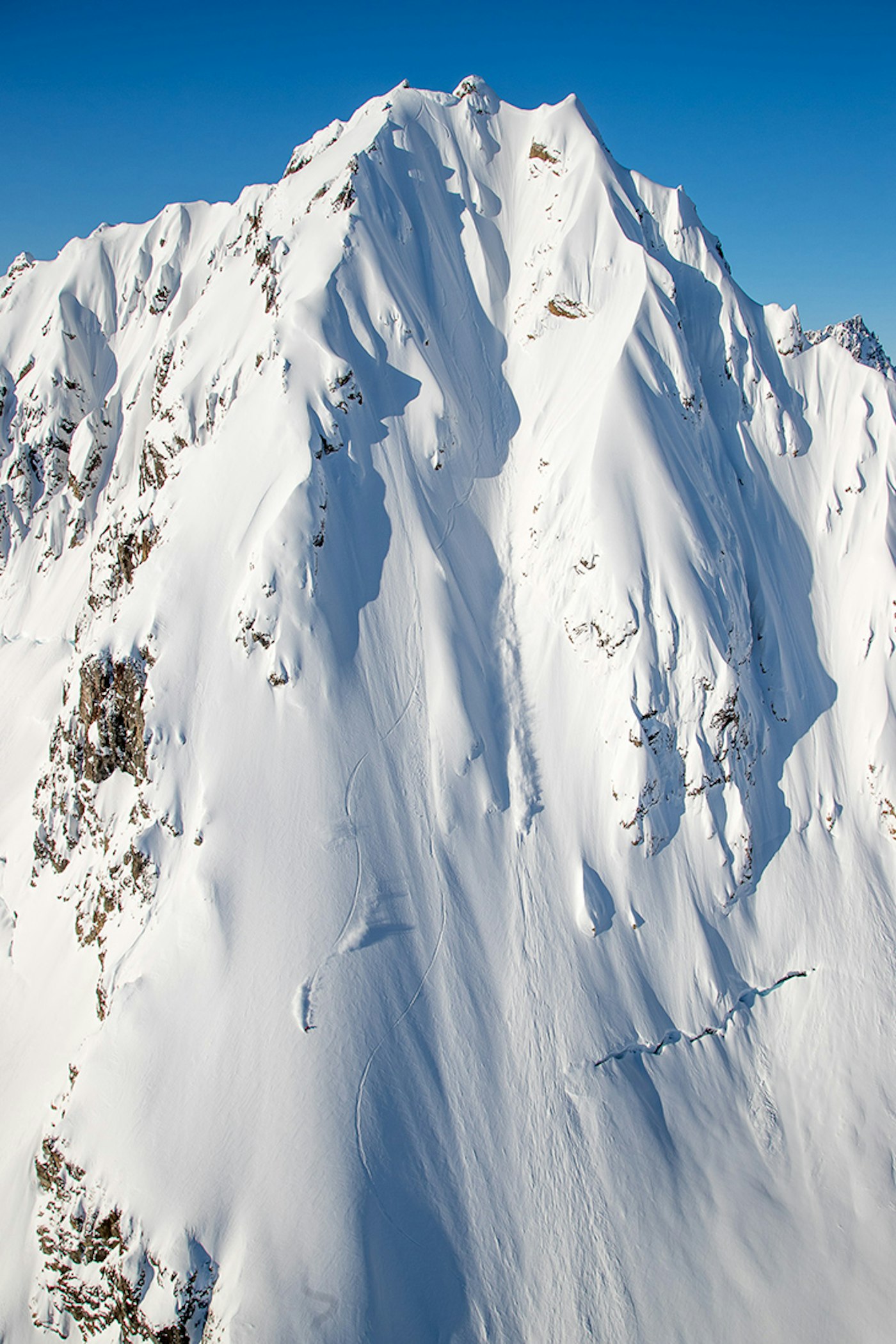 Costain descending a monstrous peak at SEABA Heli in Alaska.