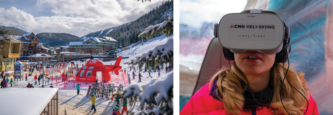 With access to all of the resorts under the Alterra Mountain Company umbrella, CMH’s reach could now extend far beyond its three million acres. LoVecchio took Lines of Sight on tour, packing the VR goggles in her suitcase and hitting the road. From Mammoth Mountain in California, Tremblant in Quebec, Ontario’s Blue Mountain to Winter Park in Colorado and Stratton in Vermont, skiers across North America were able to experience the magic of heli-skiing without ever leaving their local resort. Camped out at the base of Ikon Pass ski areas, skiers could climb aboard a 20-foot-by-15-foot inflatable helicopter modeled after CMH’s Bell 212 for the virtual ride of a lifetime.
