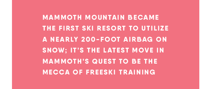 The Progression Airbags, as they’re known, are utilized by athletes for training purposes, allowing them to attempt tricks in a realistic setting with decreased risk of injury. Considered “great, big, pillow-soft air bags,” by one skier’s account, these creations are in fact ultra-durable; they resist sharp ski edges and ski poles and they’ve also been used by professional snowmobilers, motocross riders, BMX and also mountain bikers, all with heavy-duty equipment. The bags come in a variety of shapes and sizes, but, as aforementioned, only three of the 200-foot variety have been produced. Two of those three bags are currently in use at “dryslope” facilities—one outside of Montreal, Quebec, the other in Park City, Utah—and only one has been integrated into a true snow park. That’s because inflating and setting-up these bags on snow is extremely difficult. The terrain park-building experts at Mammoth Mountain are credited with achieving the feat, and frankly, no one is surprised; it’s the sort of park-building prowess that attracted the U.S. Ski & Snowboard Teams to Mammoth many years ago and kept ‘em coming back each year since. The two parties are currently locked into a partnership that will see skiing and snowboarding’s top slopestyle and halfpipe contenders training at Mammoth each year until 2019.