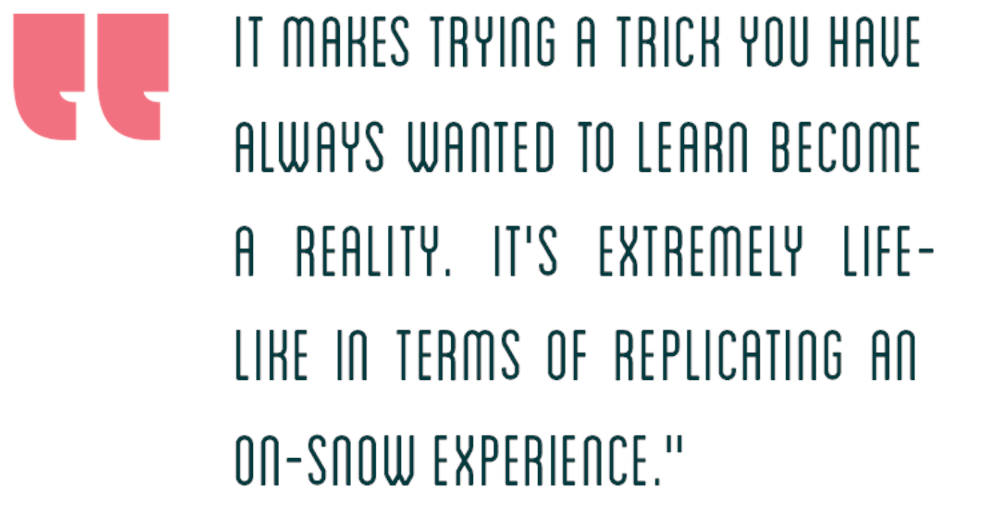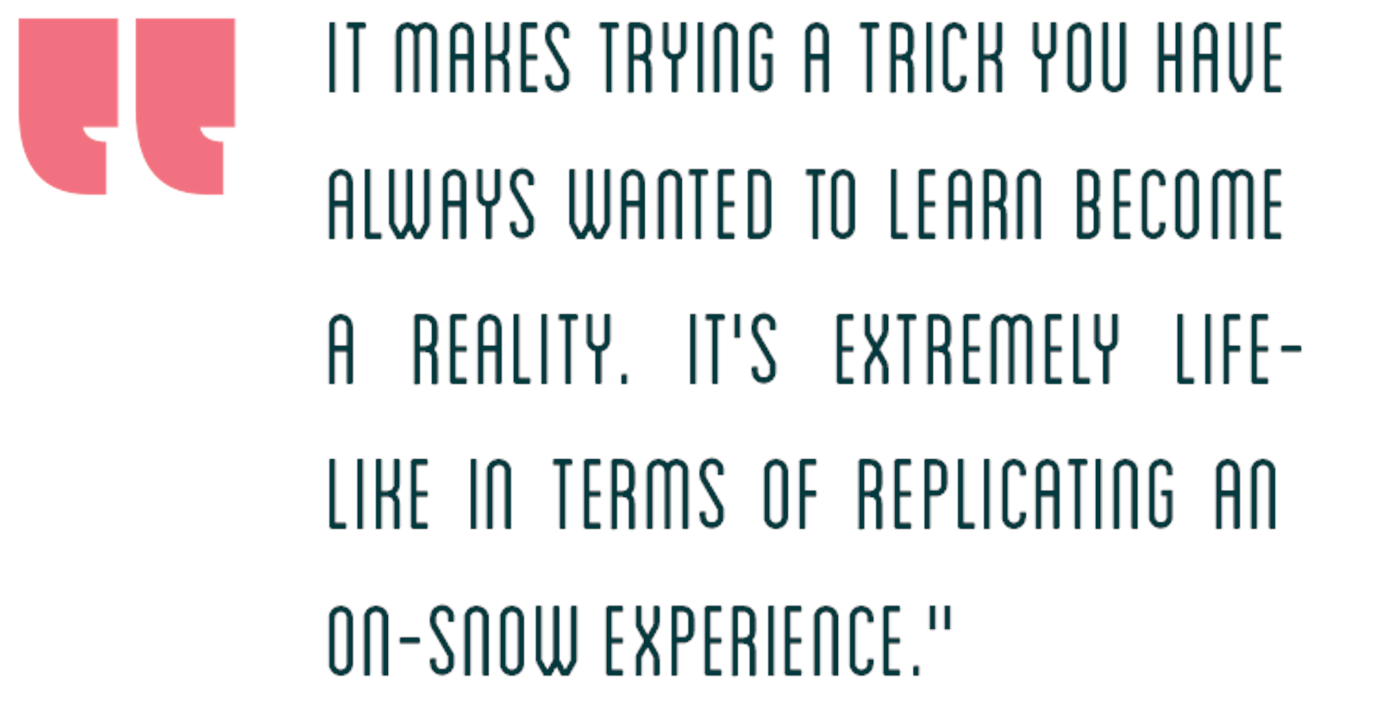 Despite the initial skepticism and those first couple of spills on the airbag, Logan says, “I learned to love it so much.” She adds, “the impact on the body is so minimal, you can [hit the airbag] day after day. It makes trying a trick you have always wanted to learn become a reality. It’s extremely life-like in terms of replicating an on-snow experience. It’s a huge confidence booster and it helps to speed up progression.”