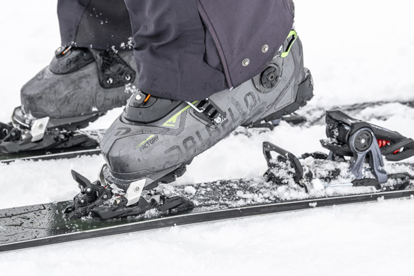 The Duke PT 16, showing one binding in downhill mode and one ready for touring.