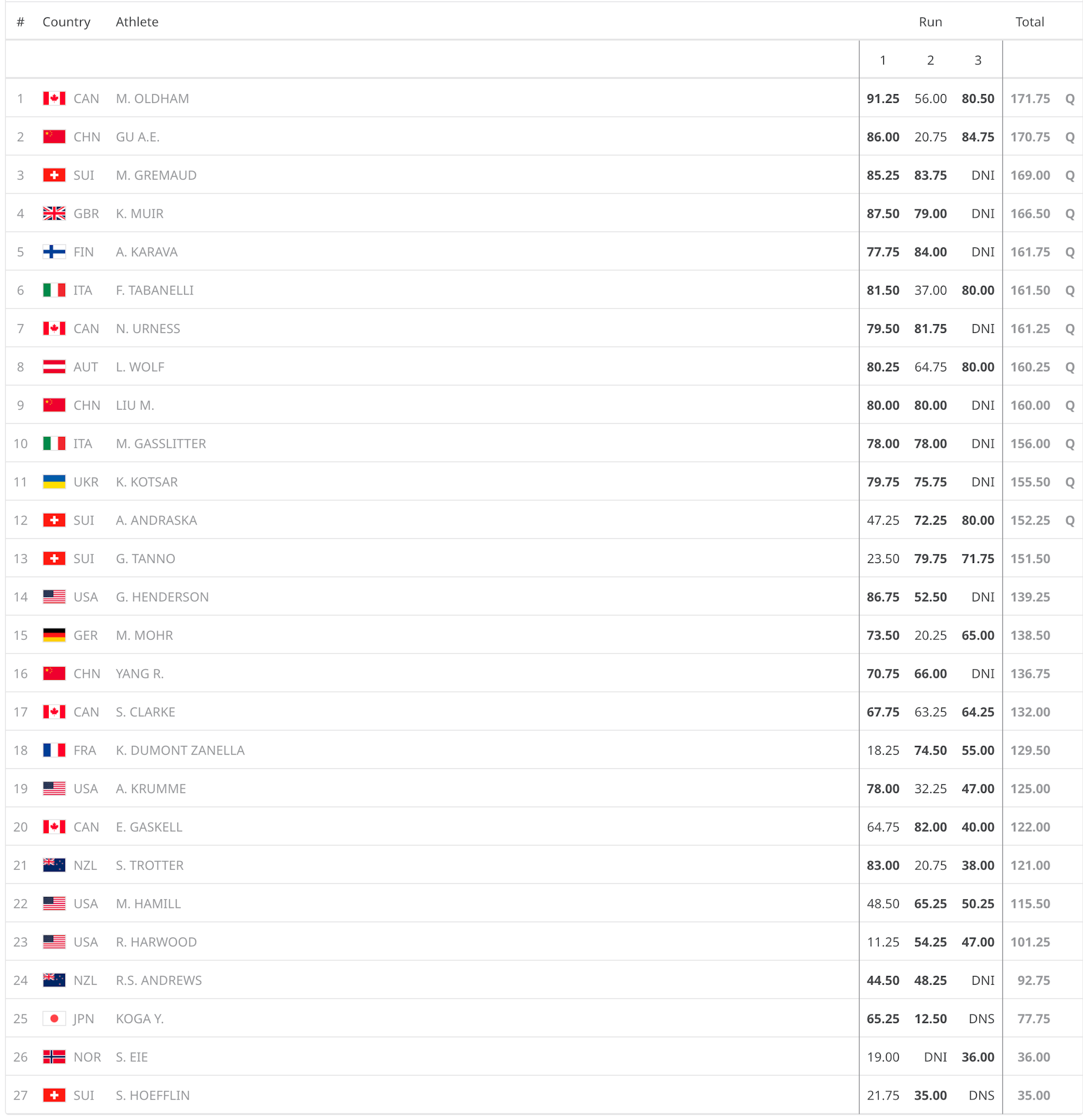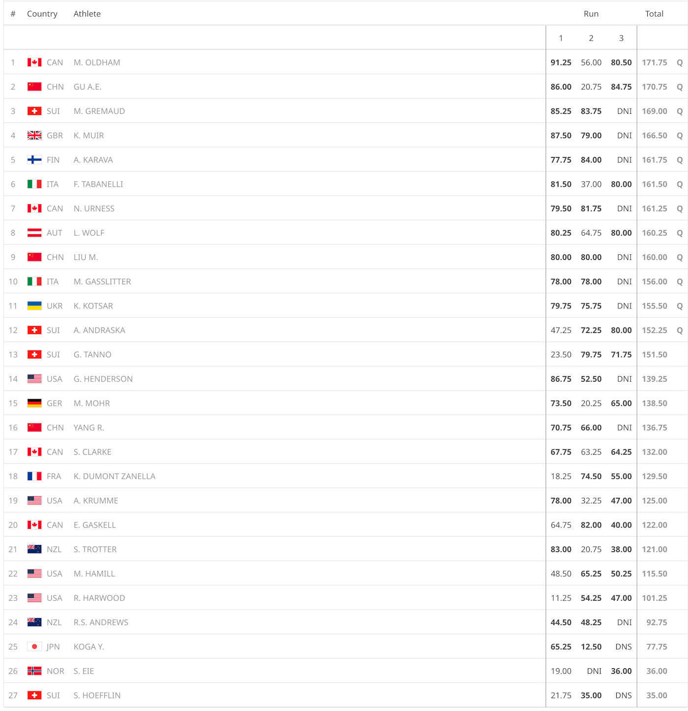 With three runs and the best two scores counting, the first jump separated the contenders. Austria’s Lara Wolf stomped a switch double misty 1260 safety for a 93.50 and the early lead. Italy’s youngest finalist, Flora Tabanelli, answered with a composed 90, while defending champion Eileen Gu opened with a right double cork 1440 safety for another 90-point score. Canada’s Megan Oldham, already the first woman to land a triple cork, matched the technical bar with a switch double cork 1260 safety. Ukraine’s Kateryna Kotsar continued her steady Olympic performance, keeping herself firmly in the mix. Run two reshuffled the standings. Great Britain’s Kirsty Muir landed a double cork 1620 safety—the same rotation that won Olympic gold four years ago—for a 93 that vaulted her into podium position. Gu’s left double cork 1260 tail came in at 61.25 after the judges docked the landing and grab, and Wolf fell attempting to back up her first score. At the halfway point, Oldham led, Muir sat second, and Tabanelli held third, with the rest of the field still within striking distance.