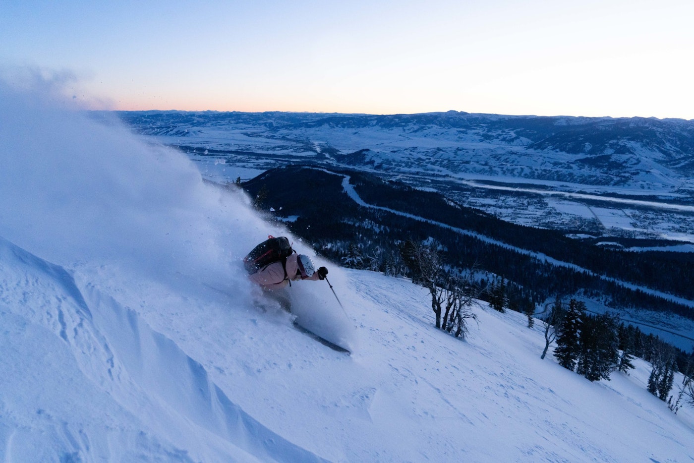 Arc’teryx athlete Lucy Sackbauer cashes in on her uphill trek above the town of Jackson. PHOTO: Leslie Hittmeier