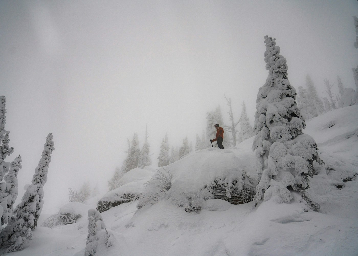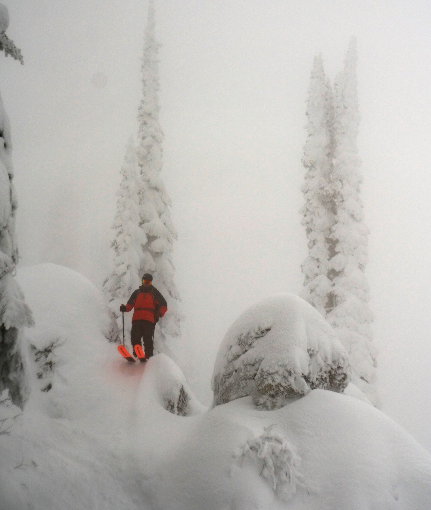 The trees are completely white, caked in a mix of rime and fresh snow. The trees look like ghosts amidst the fog and are one of the many things for which Whitefish Mountain Resort, just outside of Glacier National Park, is well-known. These magical trees, known locally as snow ghosts, offer a welcoming, wintry beauty, and provide a sense of place in today’s stormy weather. Kyle Taylor’s red jacket is my target and he hooks left, away from the lift and to the edge of the North Ridge.
