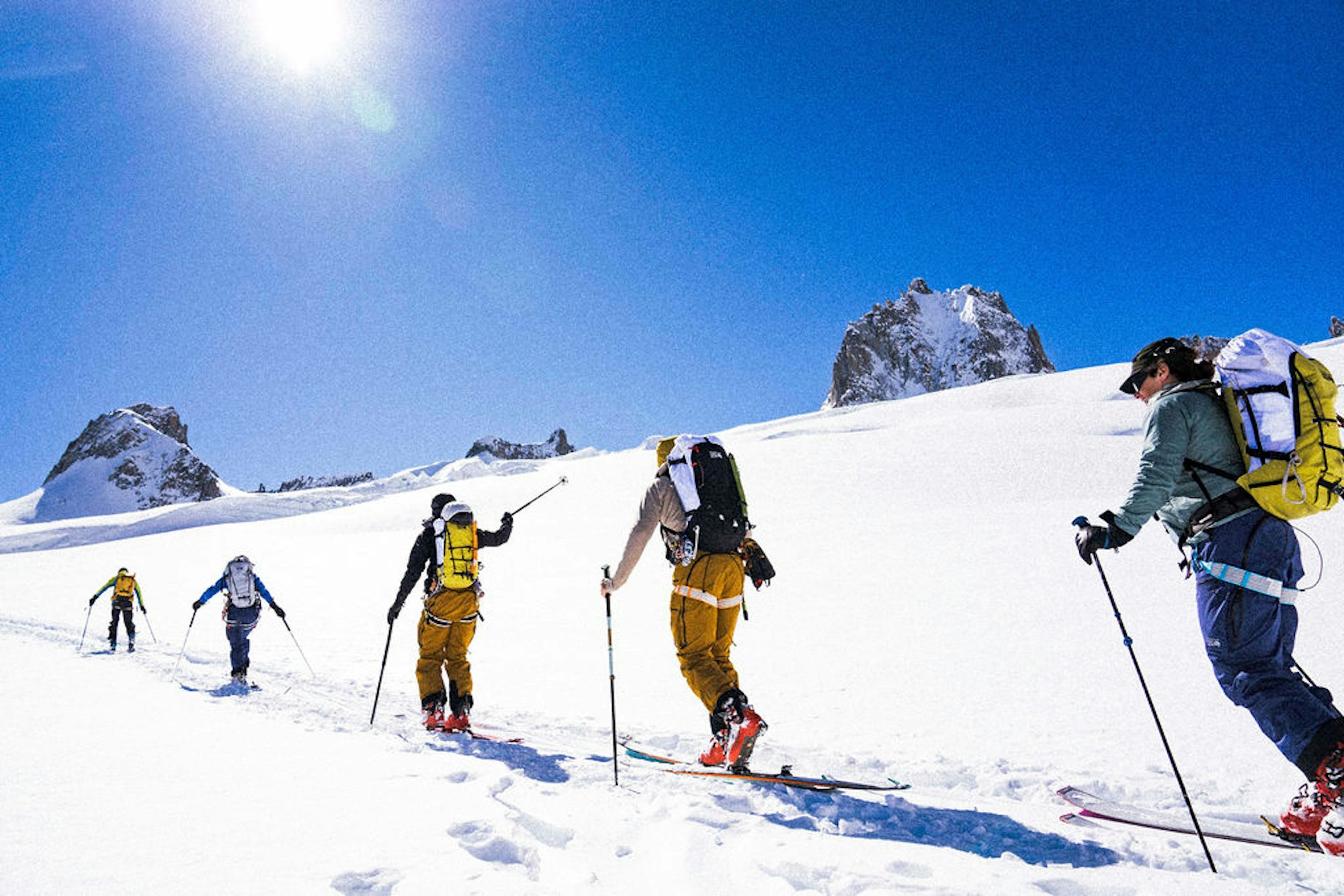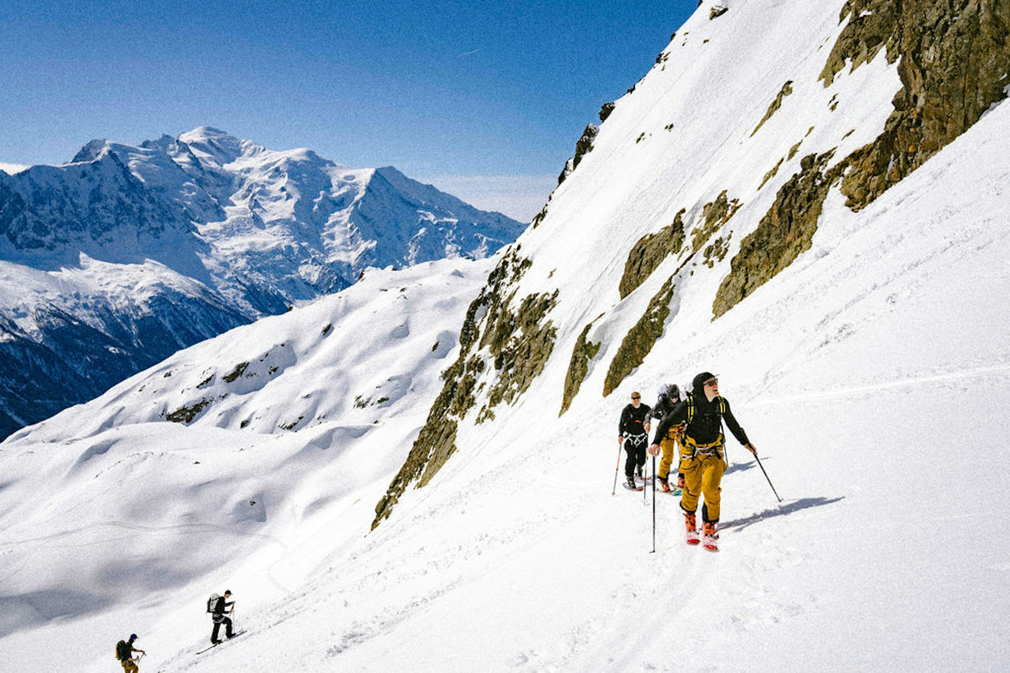 The Mythogen jacket and bib combo has been crafted for long days in high peaks, with extra attention to mobility and user customization, from pocket placement to beacon tethers to helmet and hood compatibility. This was immediately obvious in the motherland of Cham, where the crew put this new creation to work from the Aiguille du Midi to the VallĂŠe Blanche, all under the leadership of long-time MHW athlete and local legend, Vivian Bruchez.