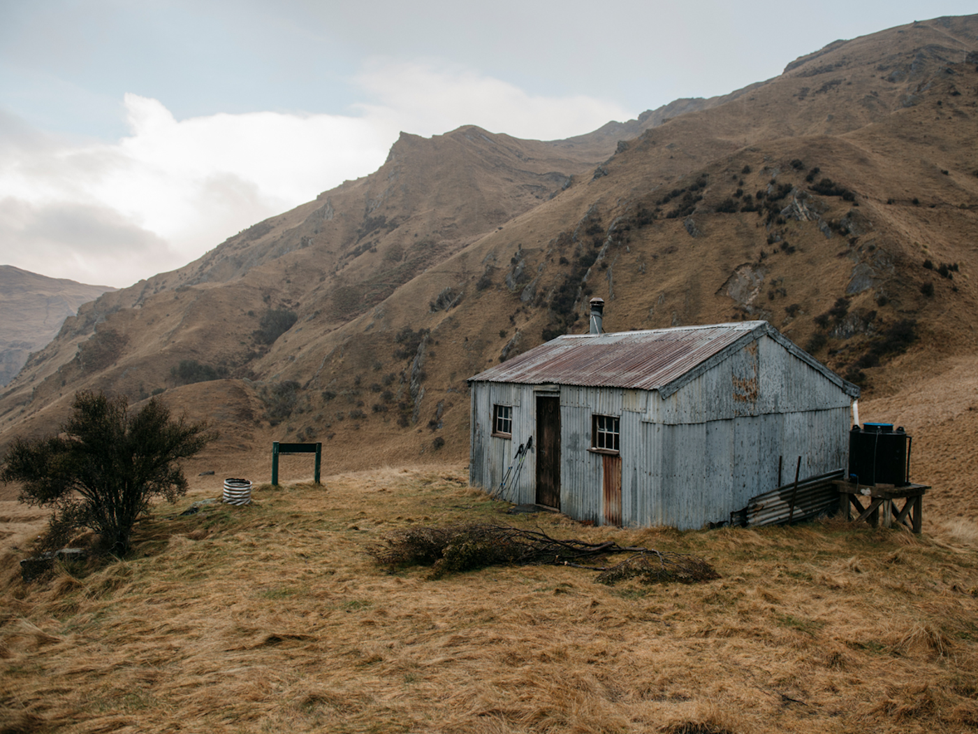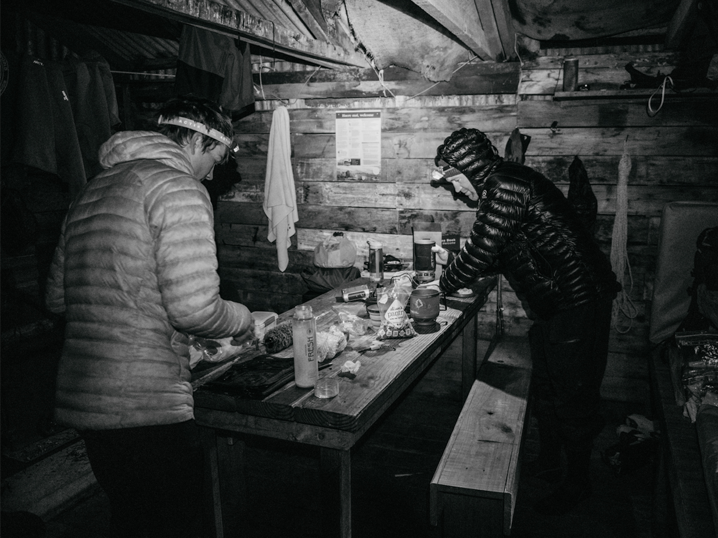 The rain has started coming down, taking a brief swing from north through to south, and now is bouncing back up off the river. I think it’s as confused as we are. It seems huts up here haven’t evolved since the 1800s, with the one we’ve staggered inside of seeming straight out of the Gold Rush. Hessian sacks are slung in tatters from the ceiling, the wind rocks the door in its frame. It does, however, manage to keep most of the rain outside, giving us a night to dry out while we finish the whisky supplies.
