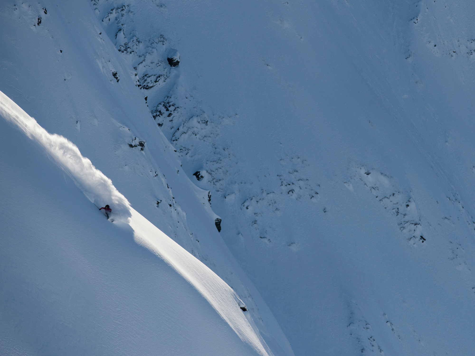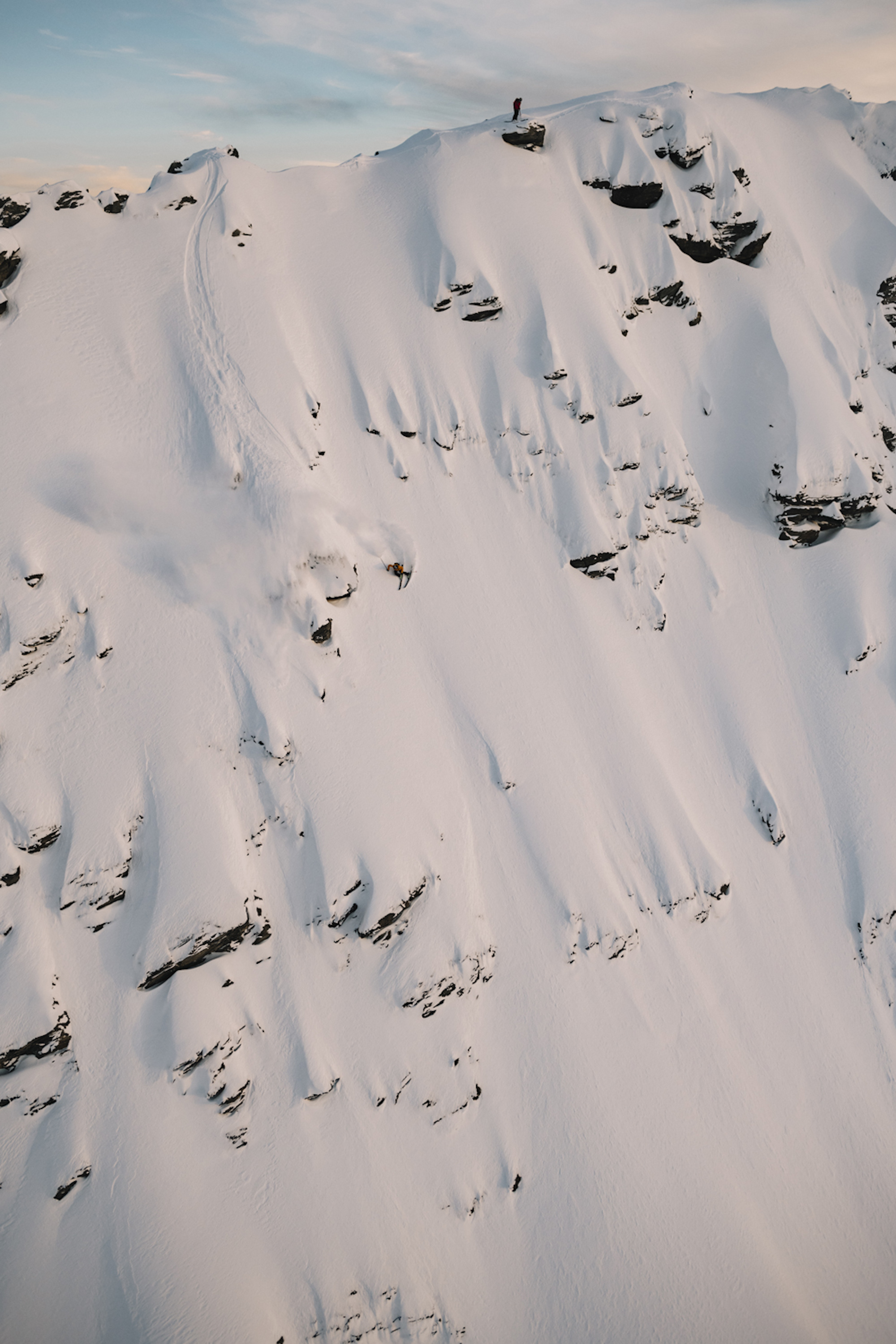 I drop in, my gas pedal is to the floor but the sluff torrent still blasts past me and off a series of cliffs as I belt left through the first narrow choke, clipping shark tags with every drawn out right footer. Flying into a narrow couloir, I run it straight and scream out the exit. Staring back up at the sluff still pouring I’m heaving for air and audibly shaking all over. I pole up to an ominously quiet Fraser and give him a huge hug before pulling his pants down to assess the damage to his ass.