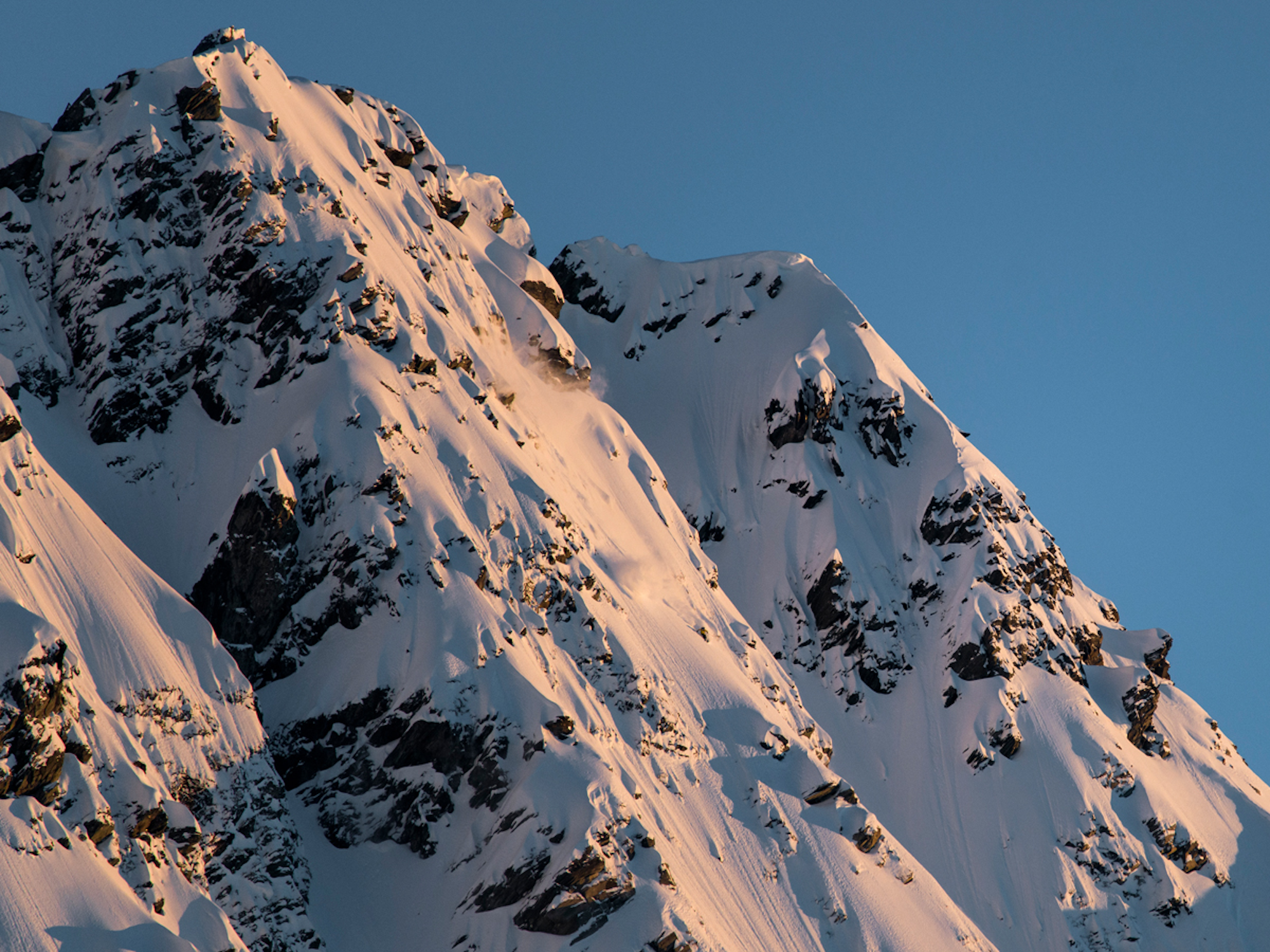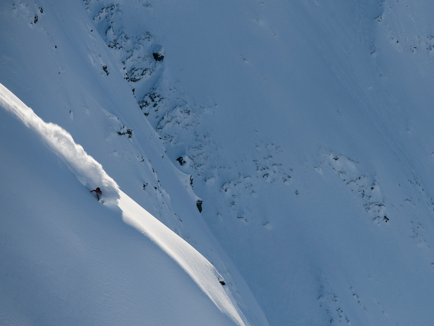 Our mechanical Valkyrie screams from the summit, rotor wash scattering the snow into billowing red mist. We, the self-sacrificial lambs, are left in the haze, clutching our skis like good ol’ boys handling their .270s. Doors pinned back, press secretary Jase Hancox and his three-camera rig have us in their sights as the B3 circles with intent. That ten-second line reconnaissance better have been accurate or this will all go to hell in a hand basket. This descent has been caressed by p-tex before, but then I’ve always thought it’s not who rides her first or last, but who leaves the most lasting impression. And boy, we were planning to go to town.