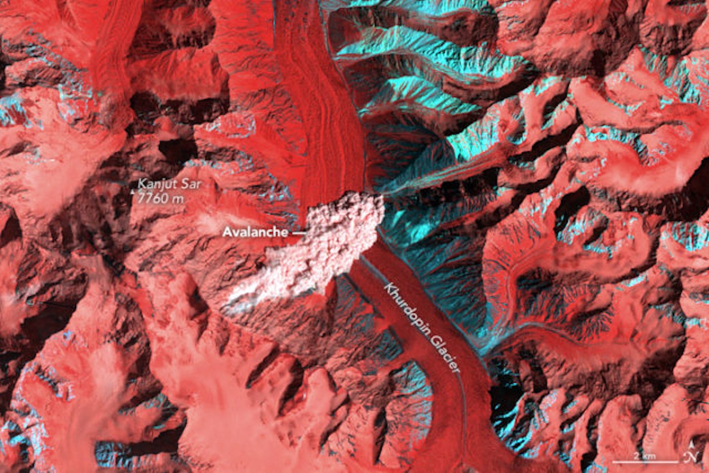 Using infrared, red, and green light waves, the image here shows an enormous avalanche charging 2,500 feet down a steep flank of Kanjut Sar, a peak in the Karakoram Range in northern Pakistan. With a height of 25,460 feet, Kanjut Sar is the 11th highest mountain in Pakistan and the 26th highest in the world. Though not frequented by mountaineers, climbers or skiers, it is well-known in the region for its impressive slides. For more information and images, check out NASA’s got the goods.