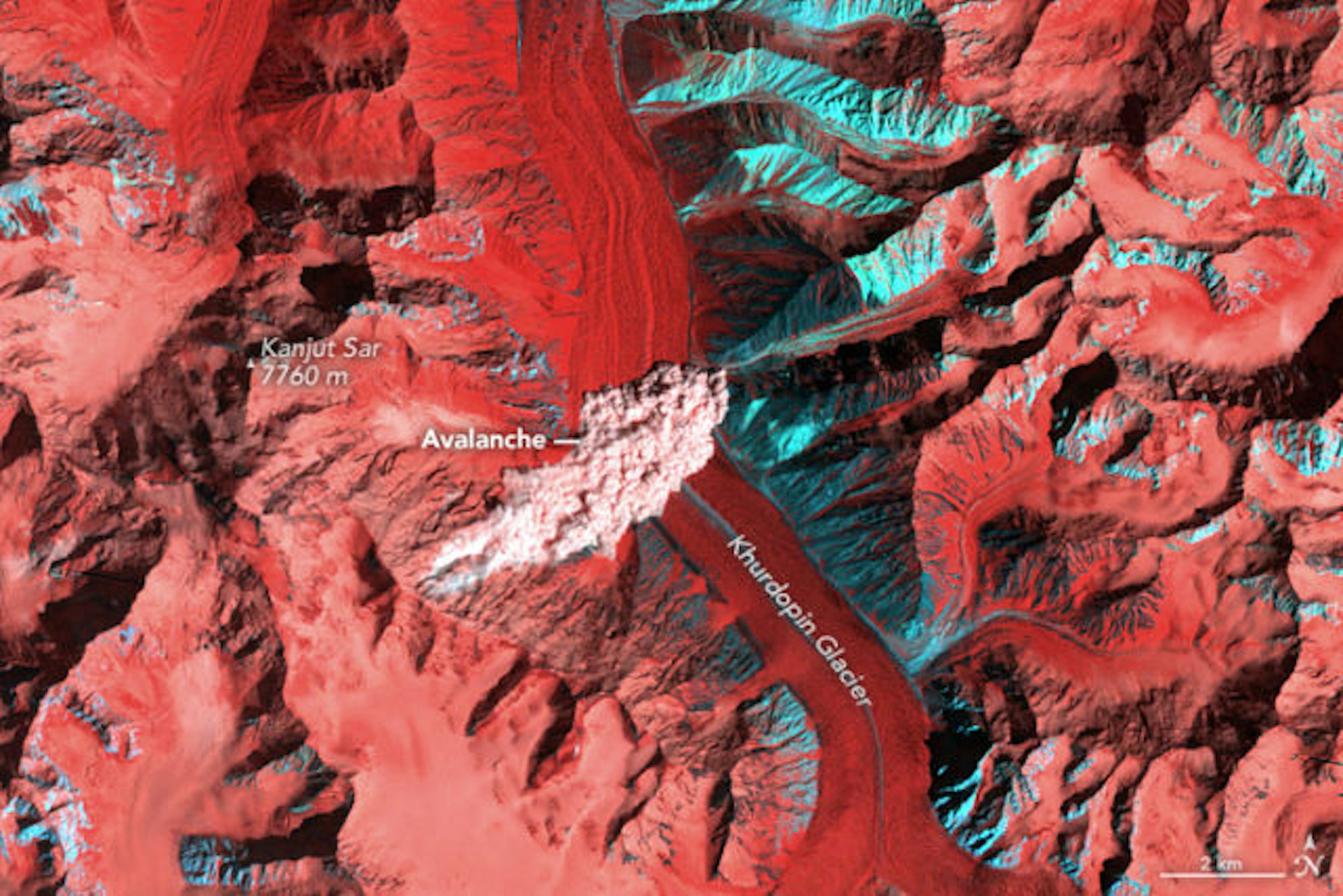 Avalanches are a terror in the backcountry. Ripping down slopes at speeds that easily top 80 miles per hour, they come and go in a matter of seconds, often leaving a trail of destruction in their wake. However, today we can appreciate the haunting beauty of an avalanche from the safety of outer space, as NASA has shared this previously unreleased satellite image from April 17, 1996.