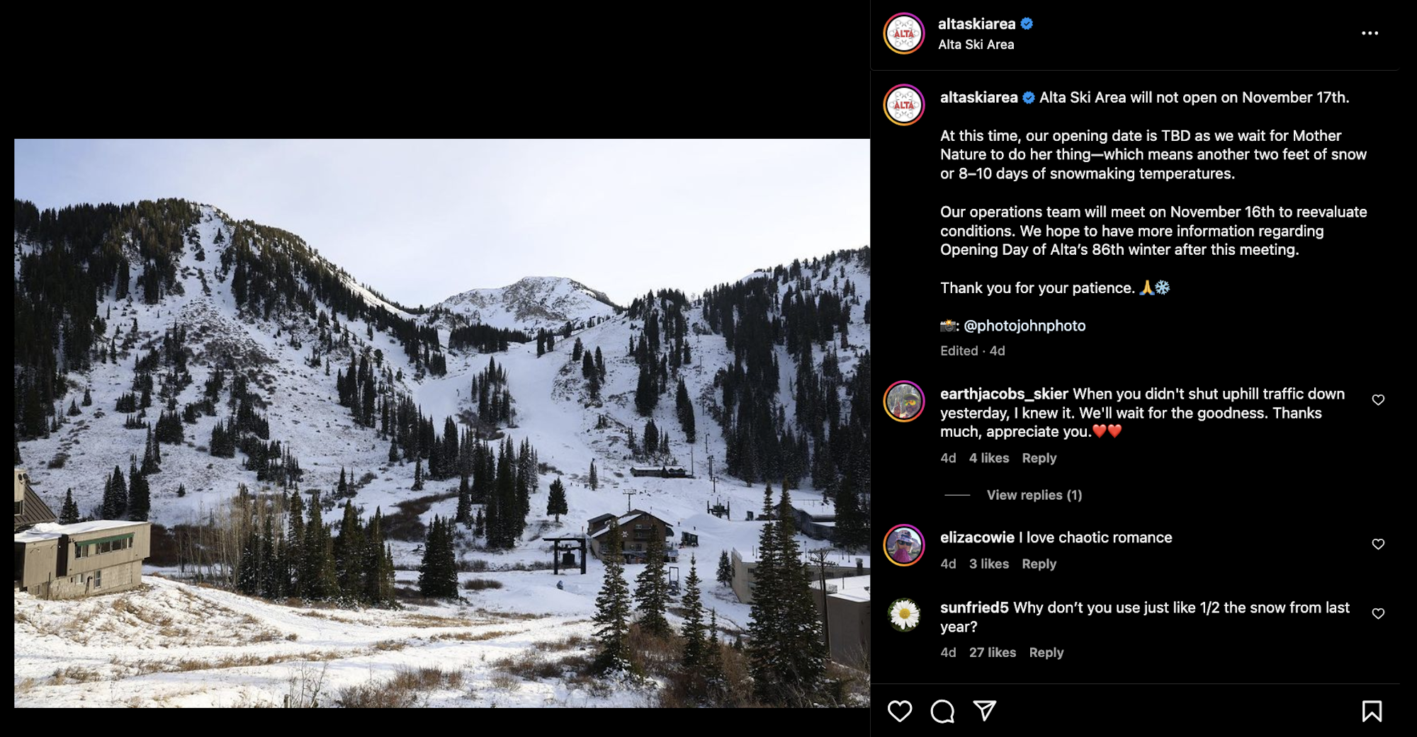 Unfortunately, the Mountain West is not having as precipitous of an early season as last year, which has forced some ski areas to push back its opening day, including Alta Ski Area. Currently, there is no projected opening day for the Little Cottonwood favorite.