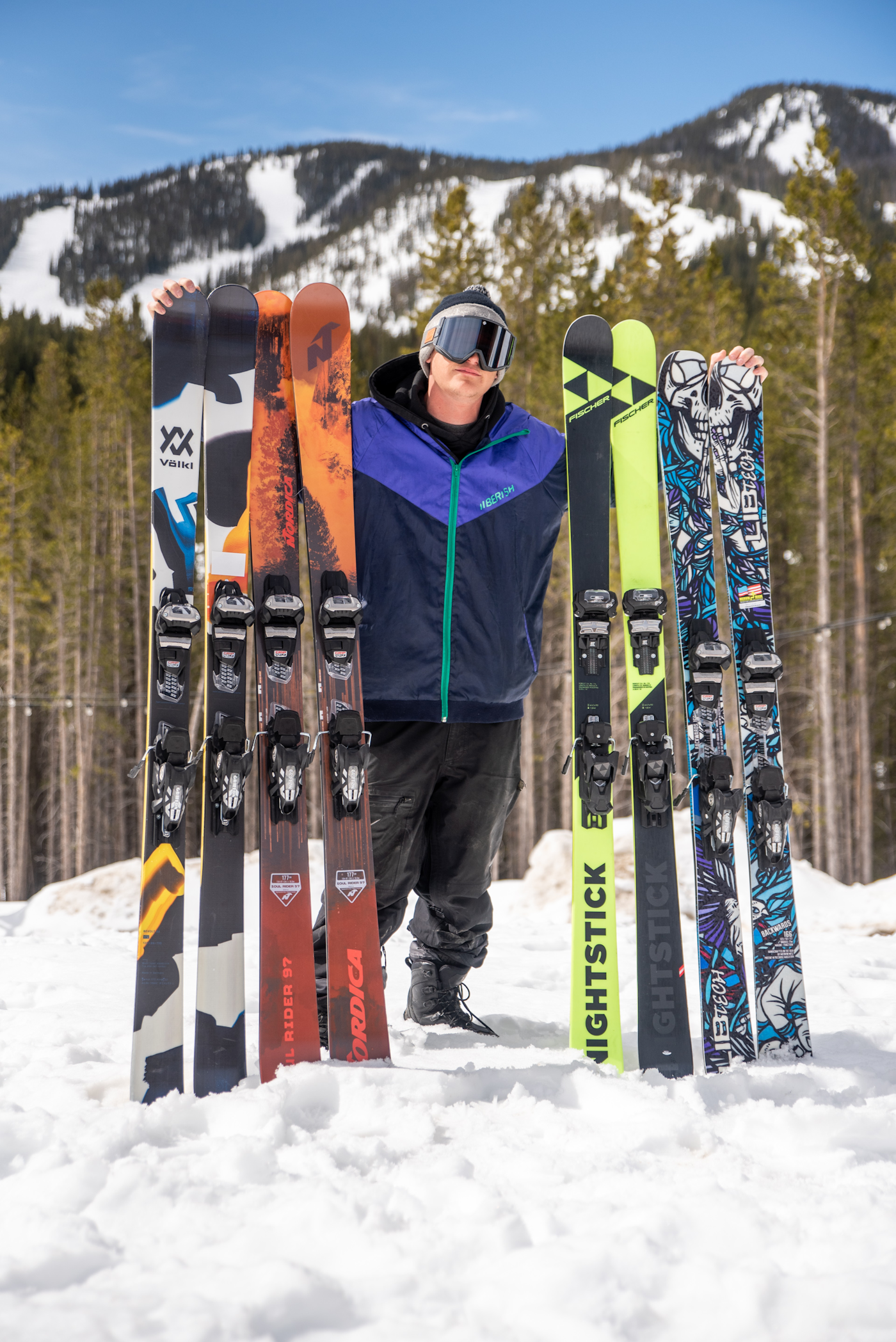 Tester Seamus Flannagan holding the Volkl Revolt 98, far left, Nordica Soul Rider 97, middle left, Fischer Nightstick, middle right, and Lib Tech Backwards.