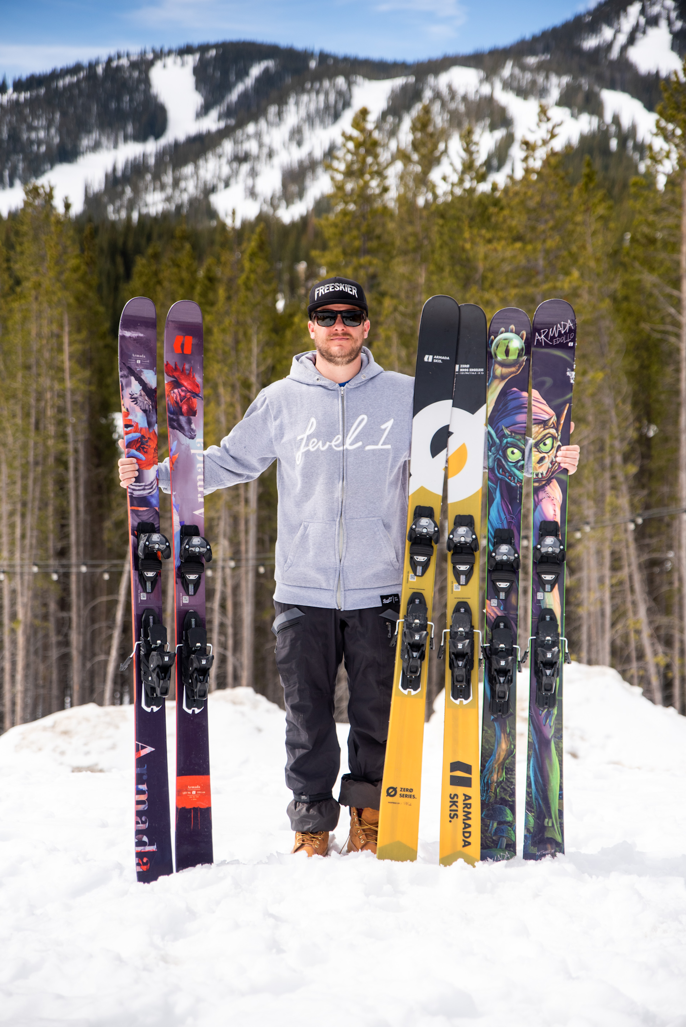 FREESKIER’s Sam Taggart with the J Skis Allplay, far left, Vacation, middle, and 4FRNT’s Vandal.