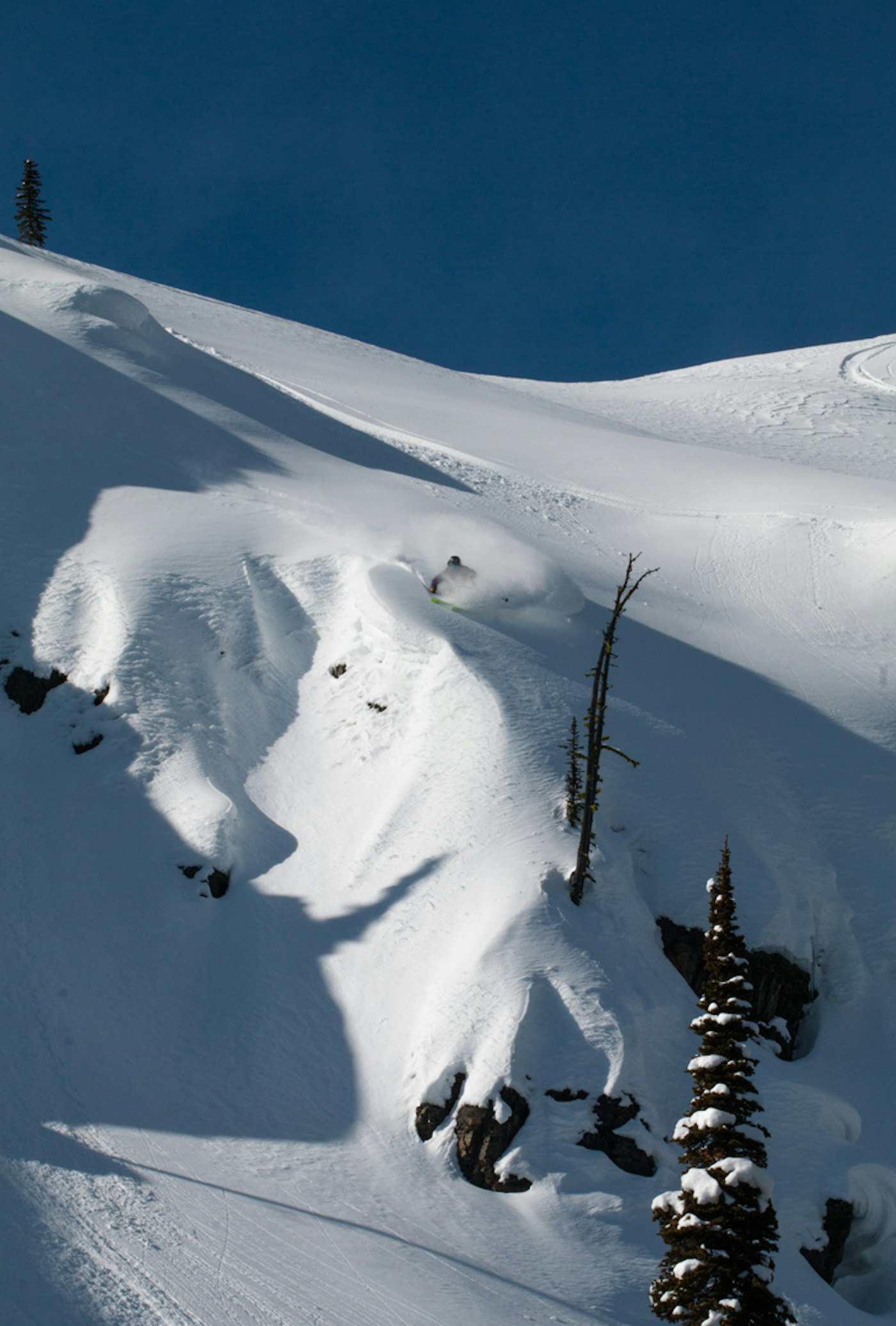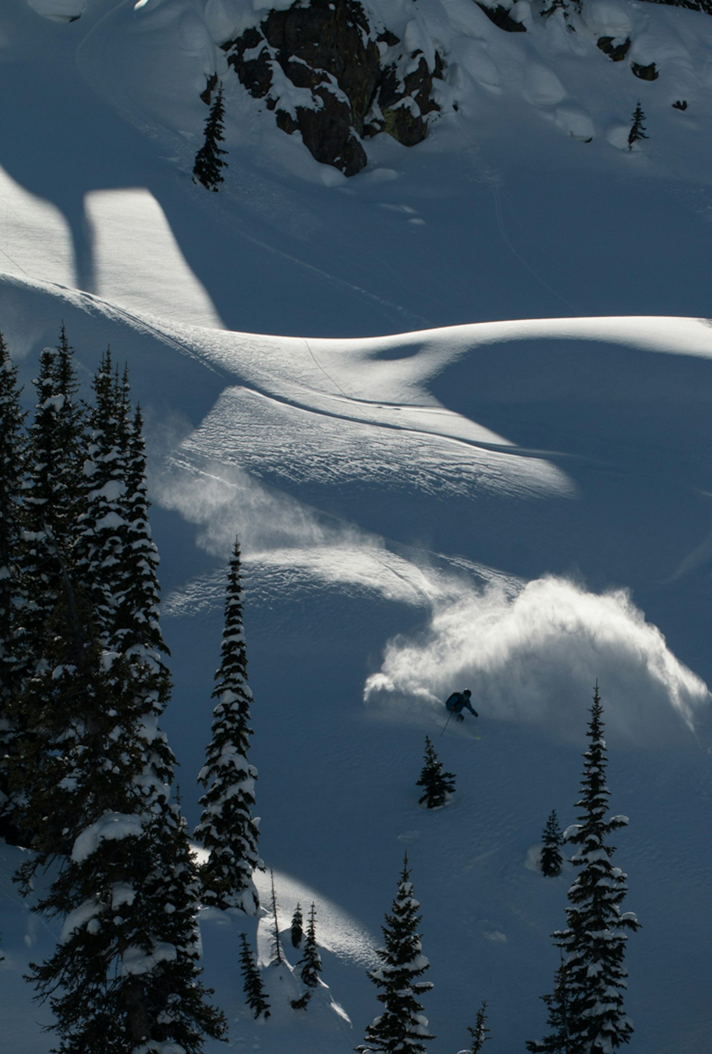 Just like most of the lessons I’ve learned thus far this winter, I quickly discovered that skiing pillows is not as easy as it looks. Being a mogul skier I thought: “How hard could skiing a couple powder bumps be?!” Turns out, it’s quite difficult. Things are way steeper than they look, and the pillows come at you fast, with little or no time to adjust from drop to drop. In this zone, I’ll be honest—I wasn’t really “getting the shot,” but luckily the lines in Kurt’s zone were abundant and we were the only ones there, affording me some time to really dial-in my approach to this new kind of skiing.