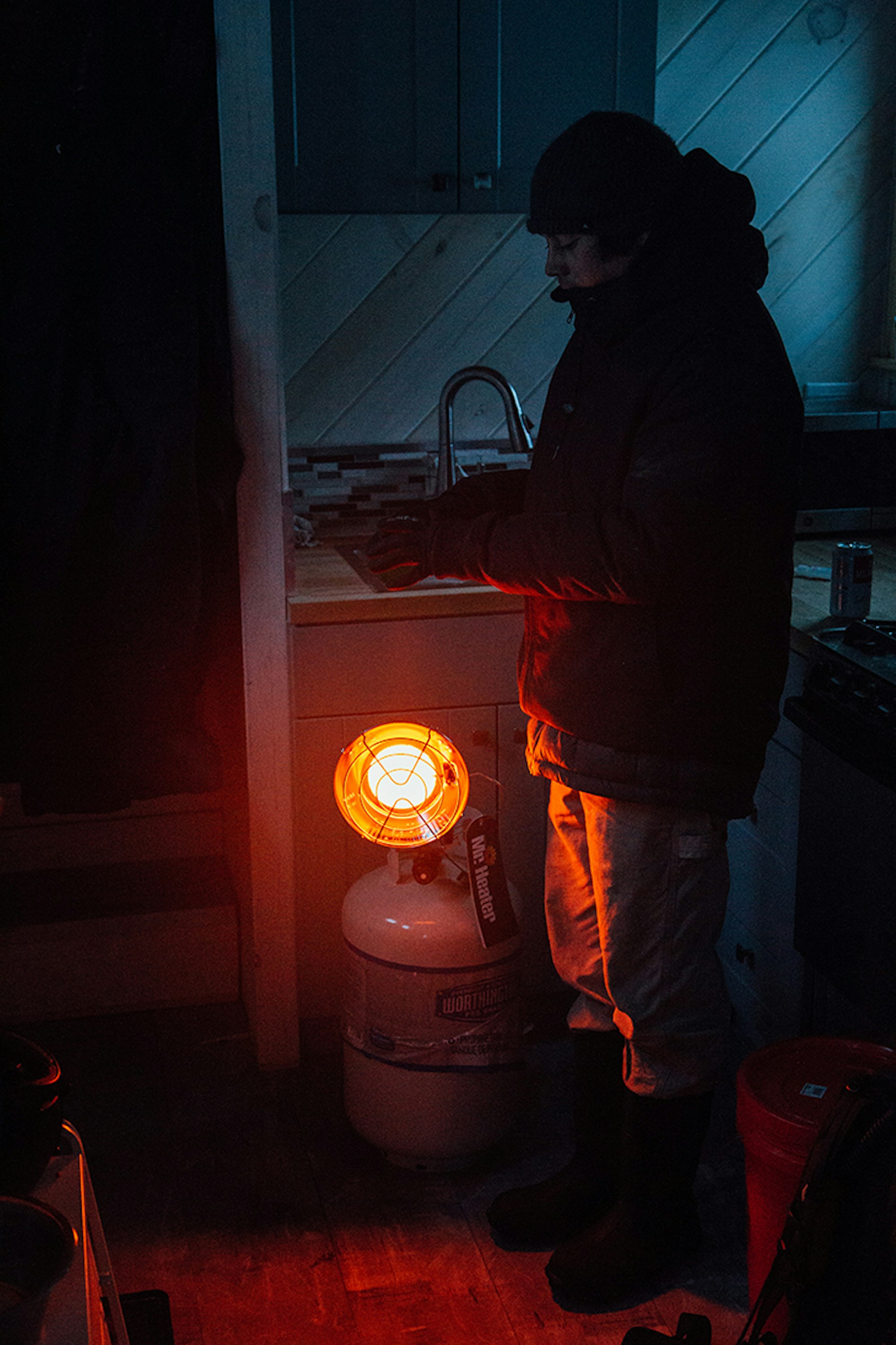 We rode about 30 miles the next day through whipping winds, and while most of the terrain was brutally scoured, we did find a couple of sheltered pockets where we could get some skiing done. We spent the remainder of the day building a jump for the next morning. After a few nights of low morale, that night we were stoked to finally have a productive plan for the next morning. We knew we could get something done. Come 7 a.m., however, that plan shifted. We awoke to freezing cold temperatures in the camper and our battery meter read 0 volts. Again we had no lights, no heat, no generator. Chris decided he’d take one for the team and head into town to troubleshoot the camper with cell service while Blake and I went out to pillage the jump we’d built.