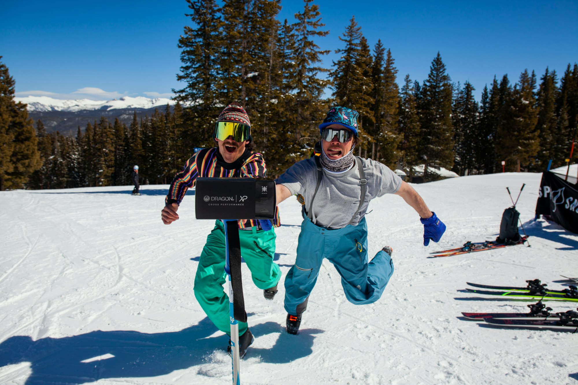 Ski tester Larry McCluskey and 4FRNT’s Sam battle it out for a pair of Dragon sunglasses. PHOTO: Erin Spong