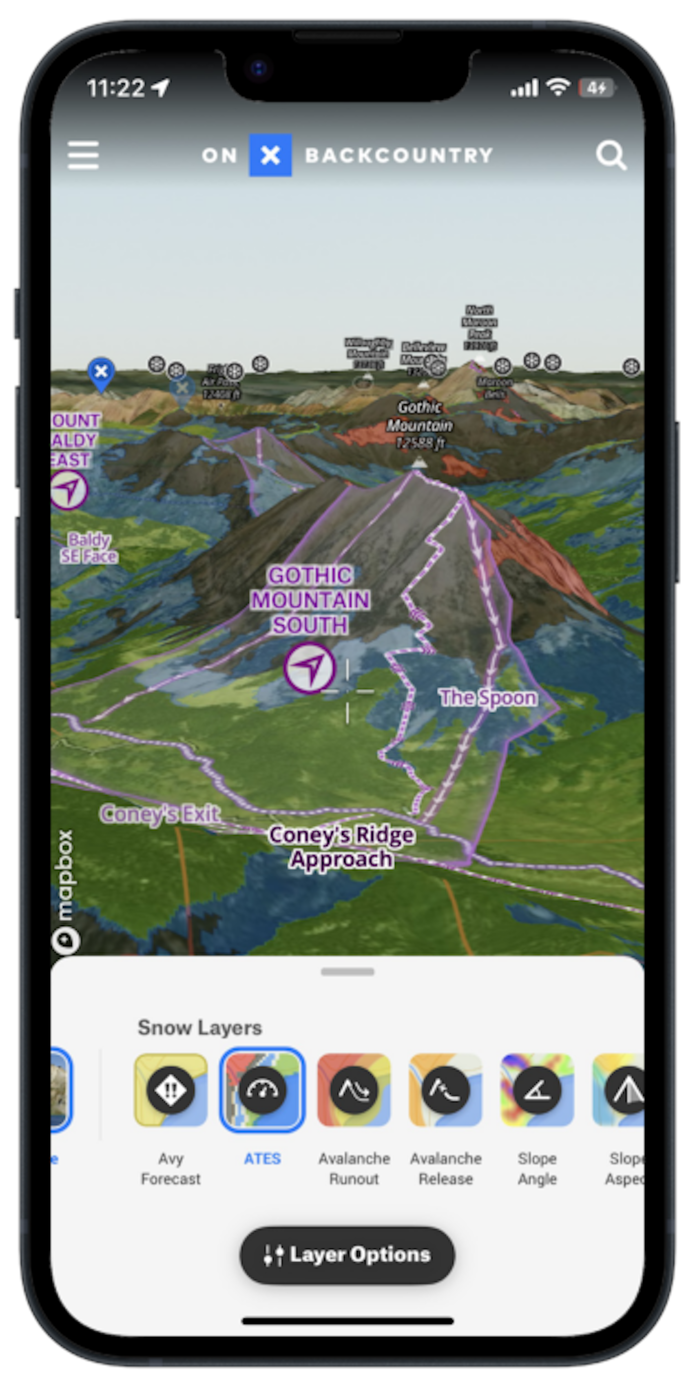 Perhaps the most revolutionary feature in all of onX Backcountry, the inclusion of ATES (Avalanche Terrain Exposure Scale) marks a milestone in backcountry travel. ATES was released in December of 2023 on the app but was first developed in 2003 by Parks Canada. The system uses 11 different terrain inputs, including slope angle, starting zones, runout zones, forest density and more. Researcher John Sykes paired up with onX to bring a digitized form of ATES to the United States for the first time. According to the original press release, Sykes’s algorithm, called autoATES, “analyzes terrain in popular winter regions in onX Backcountry,” and applies the scale based on those different terrain inputs.