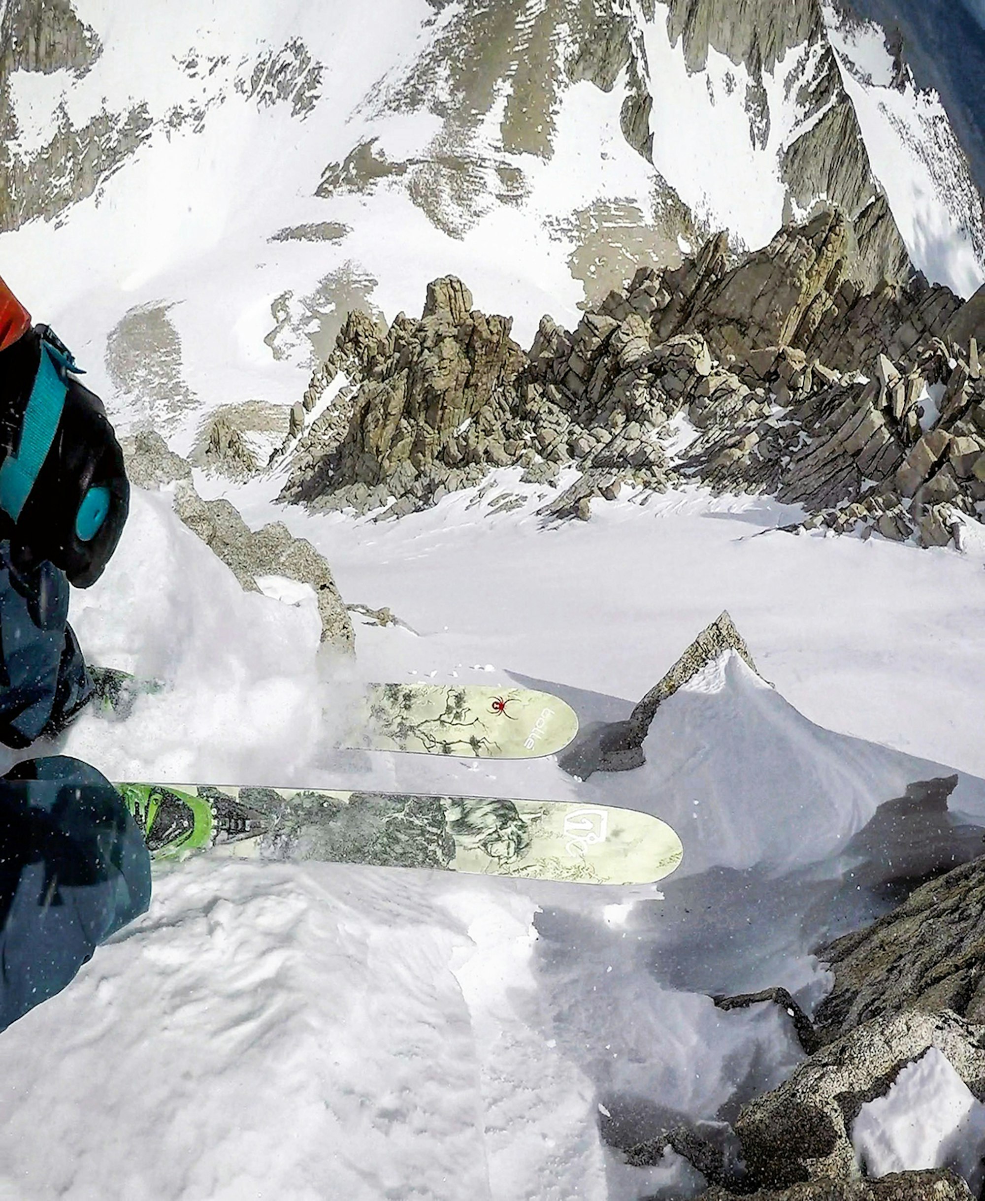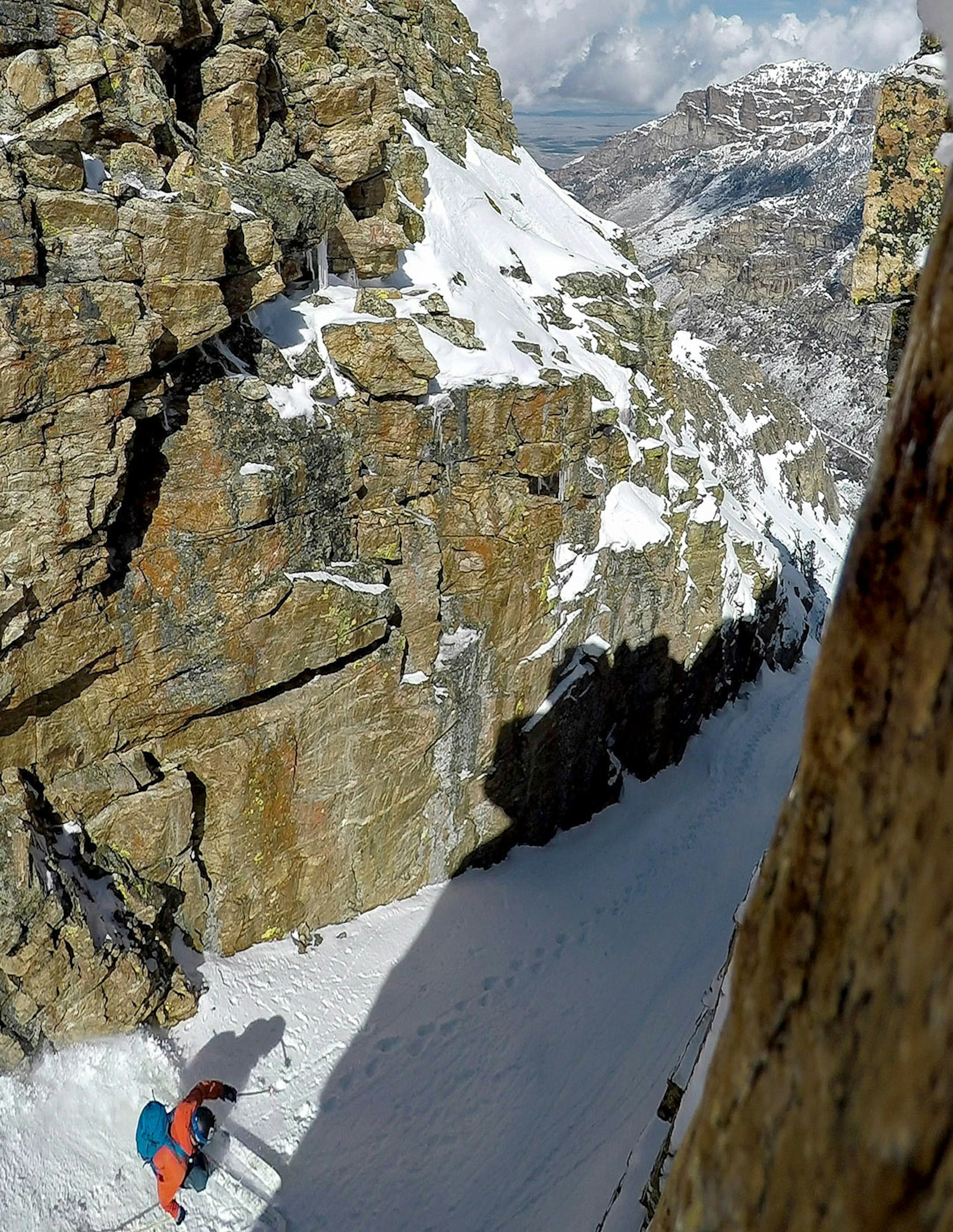 The whole way up we weren’t sure if we were going to make it, but we finally got to the last col (the lowest point of a ridge or saddle between two peaks), about 500 feet from the top of the mountaineer’s route, and there were black clouds and 60 to 70 mile-per-hour gusts, and every time a gust would come you’d have to stick your ice axe into the slope and hold on for a second until it blew over. Then we’d go 10 or 20 steps and do it all over again. It was pretty gnarly but we finally made it up to the top but couldn’t find the route to drop in that actually still had snow, so we had to pick our way around. We kind of had to hack our way into it, and the whole time the wind is blowing back and forth, threatening to knock us off the north face and fall down the whole thing. That was probably the scariest part of it. But we skied down some chalk at the top, then the top of the couloir involved jump-turning on refrozen spring snow, but then halfway down the mountain the snow turned to corn, and we skied 3,000 feet of perfect corn back down. The day turned into a really great one.