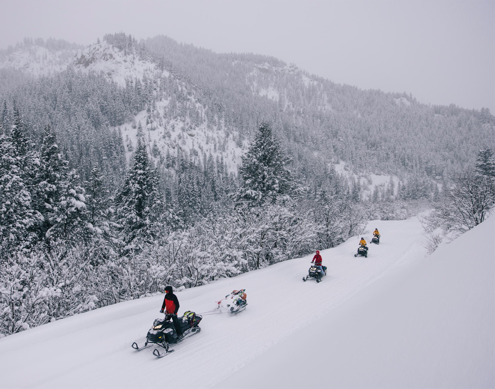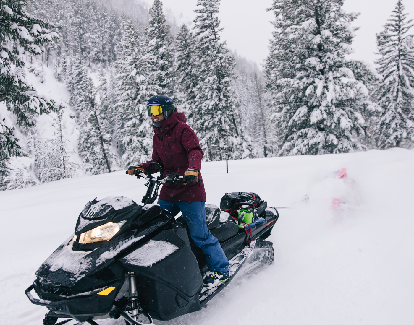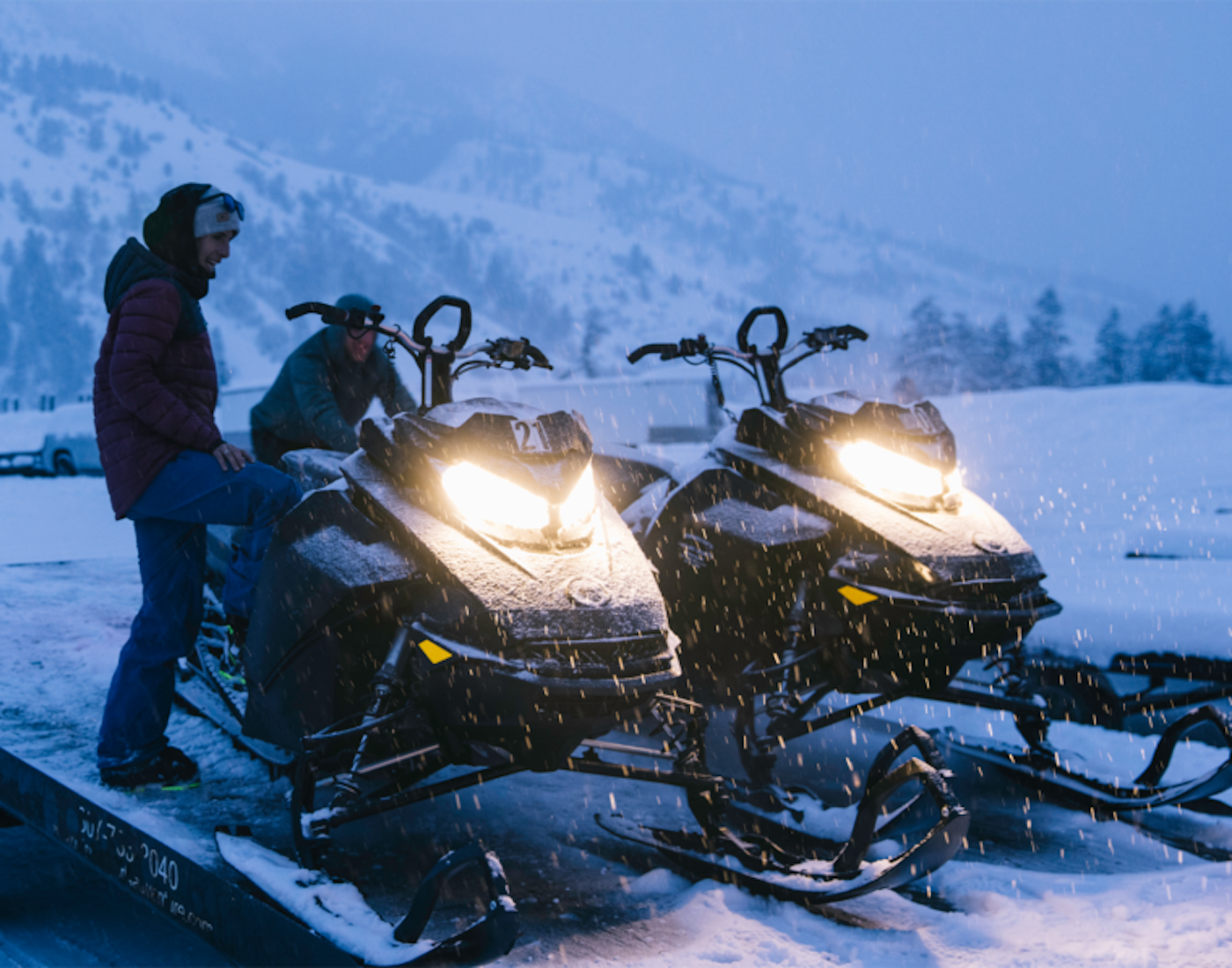 Up early on day two, we headed out for a new tour, this time to a ridge we spotted a day earlier. The turns were better than expected and, by lunchtime, we were back at the snowmobiles, scheming our next move.