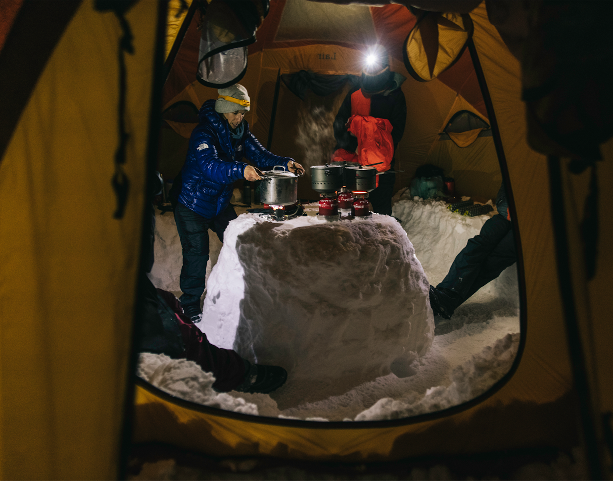 After some debate on the best location, we found a wind-protected spot near a small creek, which would save us considerable time and fuel without having to melt snow. We spent most of the afternoon building platforms, setting up the tents and crafting the inside of the cooktent, which nostalgically feels like building forts as a kid.