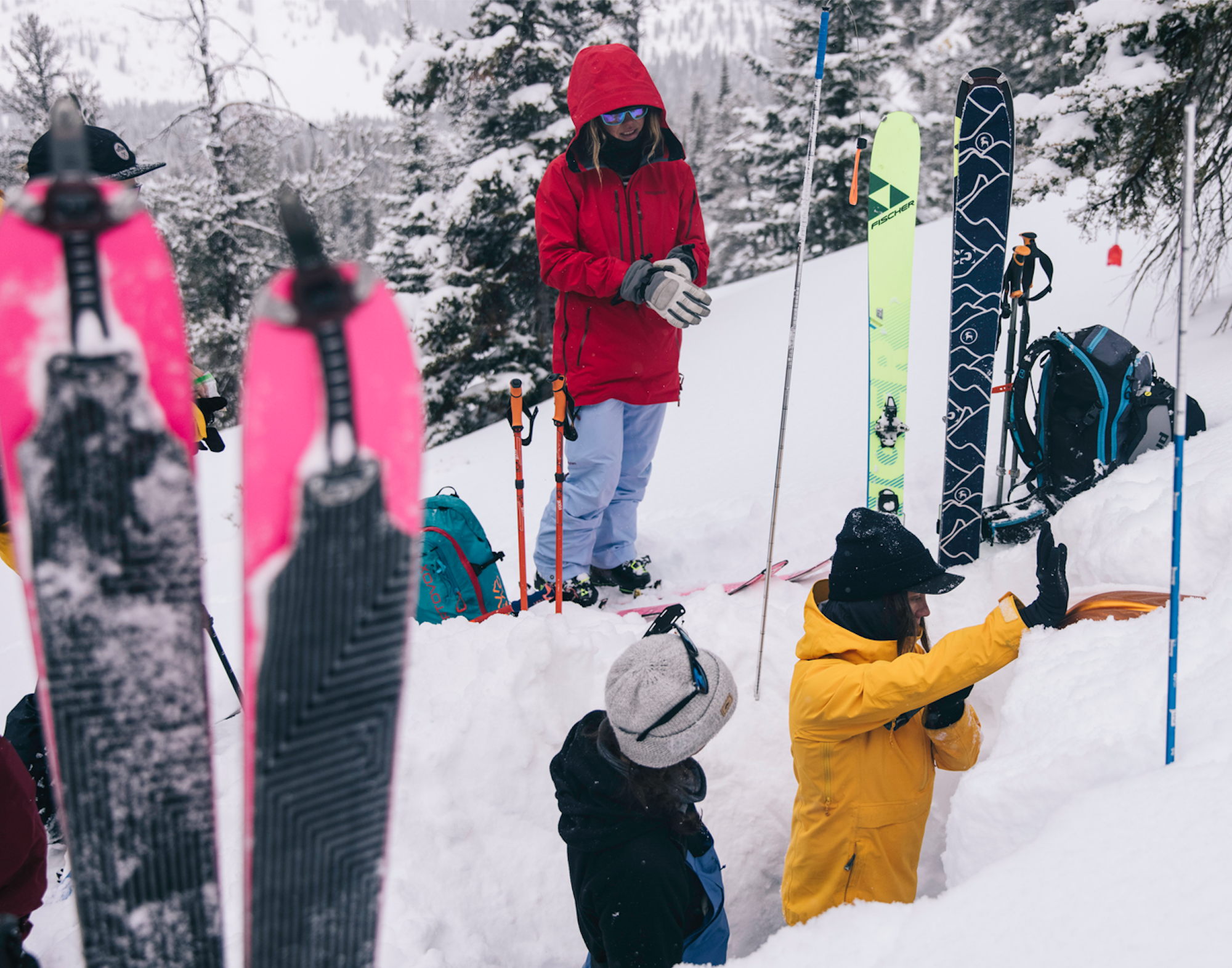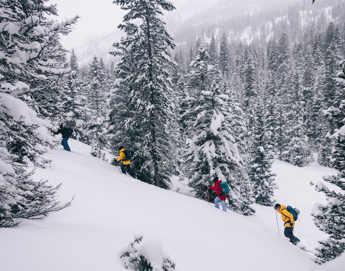 The next day we snowmo’d further up the valley and subsequently skinned up a north-facing slope, with hopes it was holding more snow and had a more protected persistent deep layer. After digging a pit to assess the snowpack, we felt good about continuing upward, and climbed nearly 3,000 feet to the base of a big cliff band, before ripping skins and dropping in.