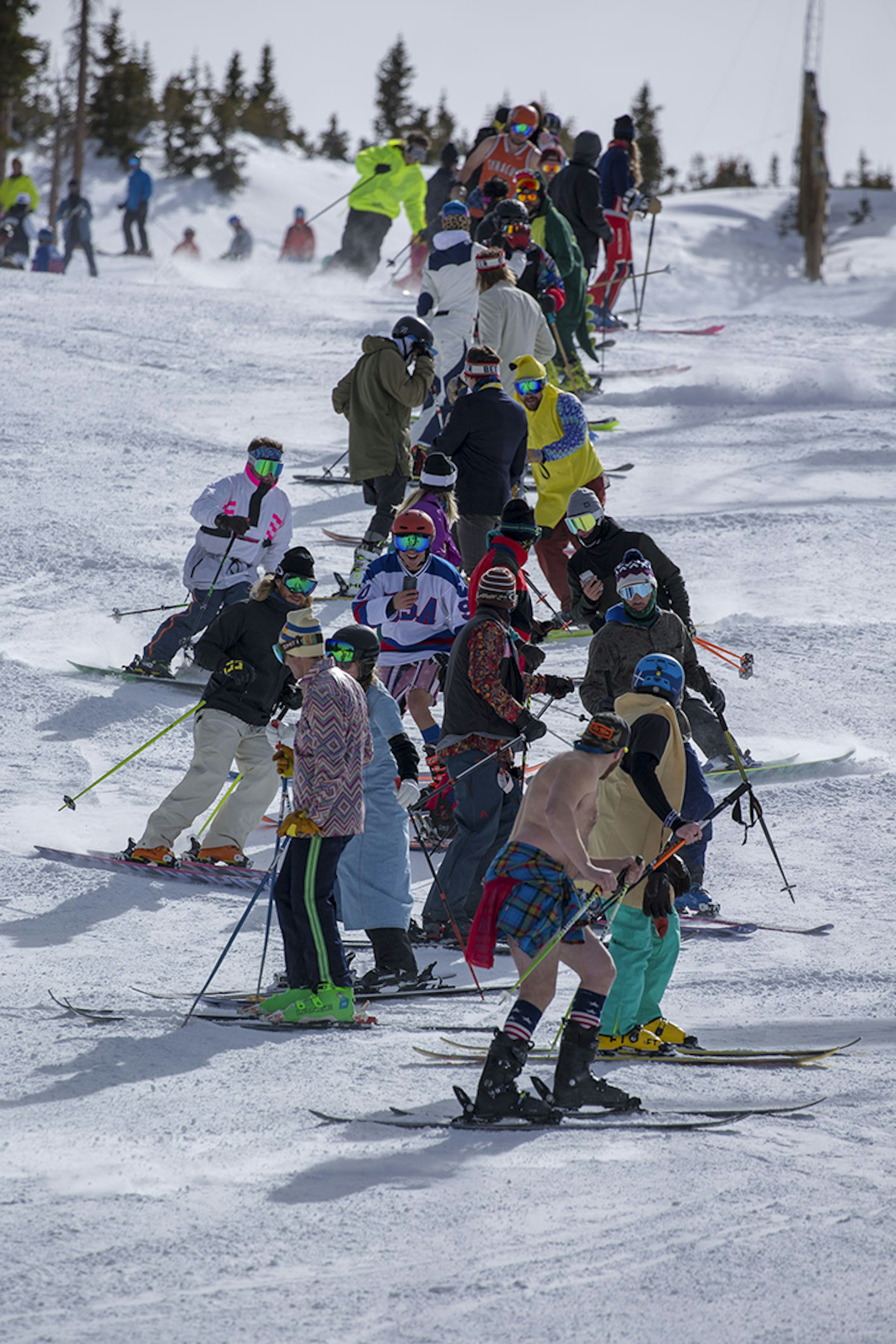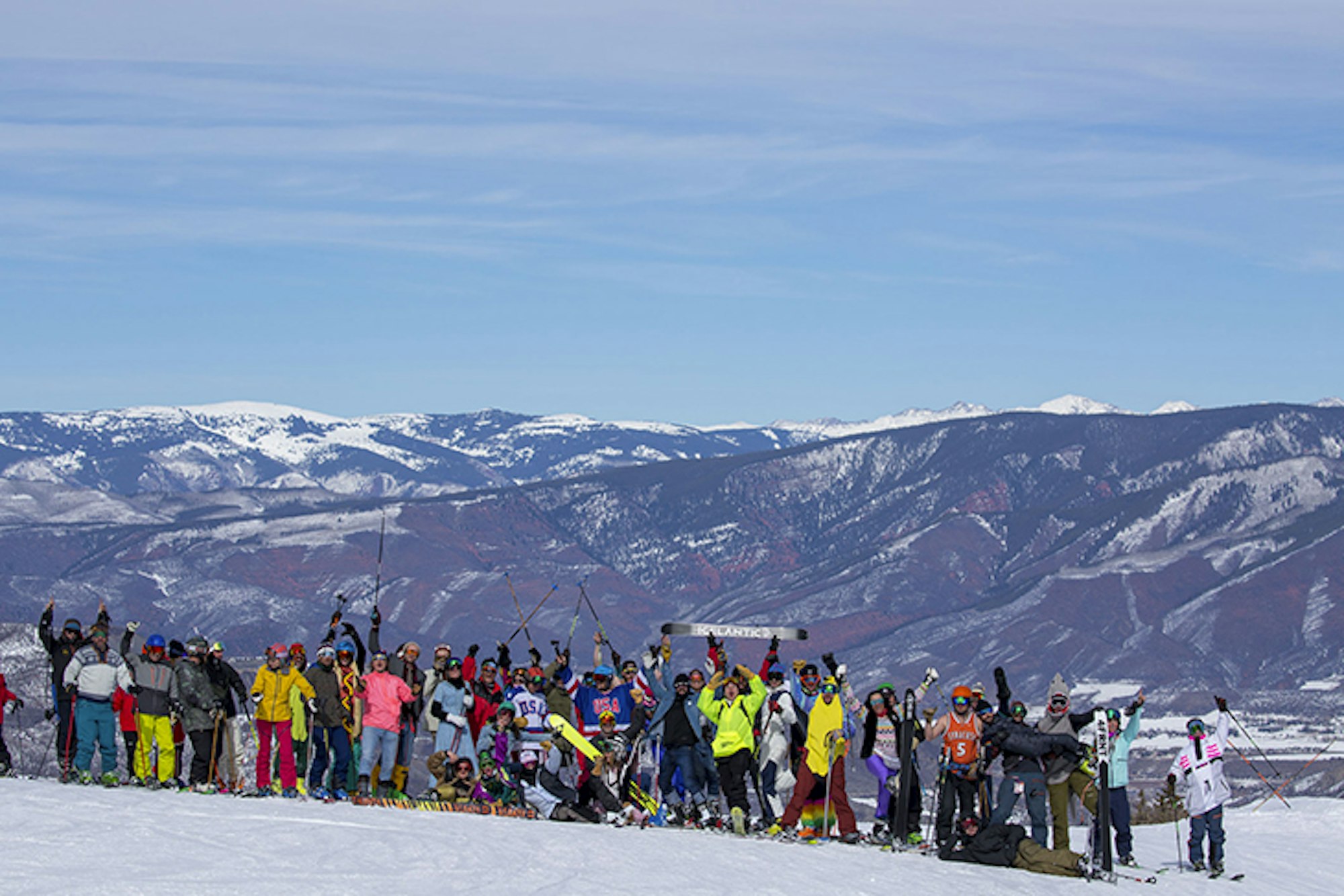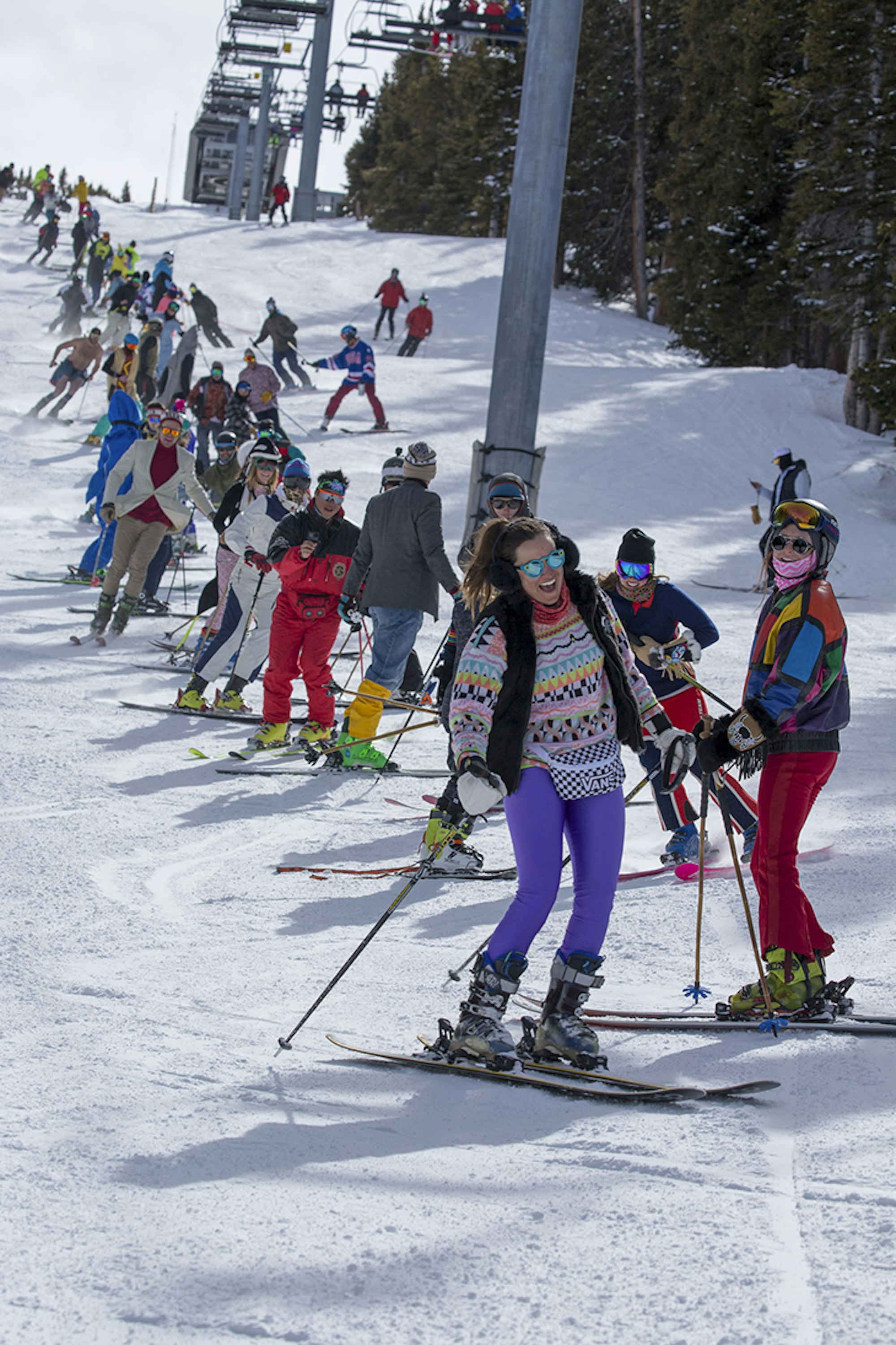The welcome crew, recruiting ski testers to join the monstrous human slalom on Snowmass. Photo: Matt Power